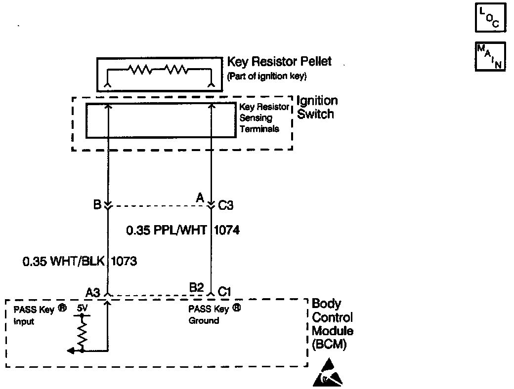 Inserting the PASS-Key(R) (with resistor pellet) in the ignition lock cylinder completes the PASS-Key(R) circuit. Contacts in the ignition lock cylinder mate with the pellet contacts. The Body Control Module (BCM) compares the resistance value of the key pellet to the valid resistance programmed into the BCM. If the proper resistance value is read, the BCM allows the following functions to occur: