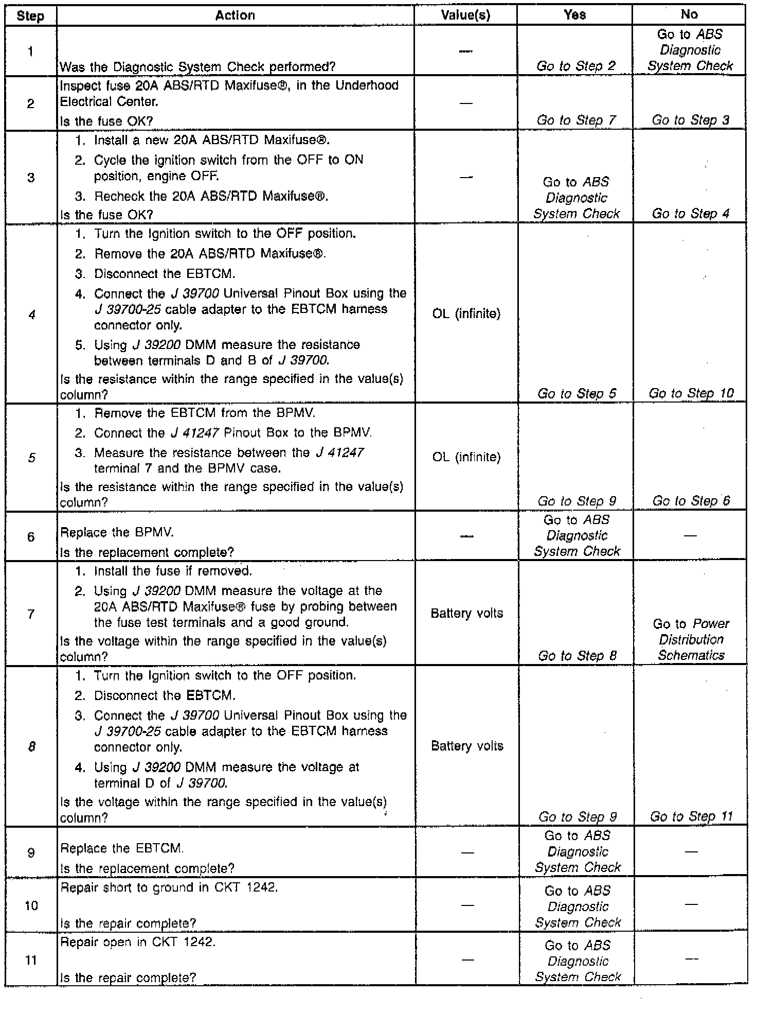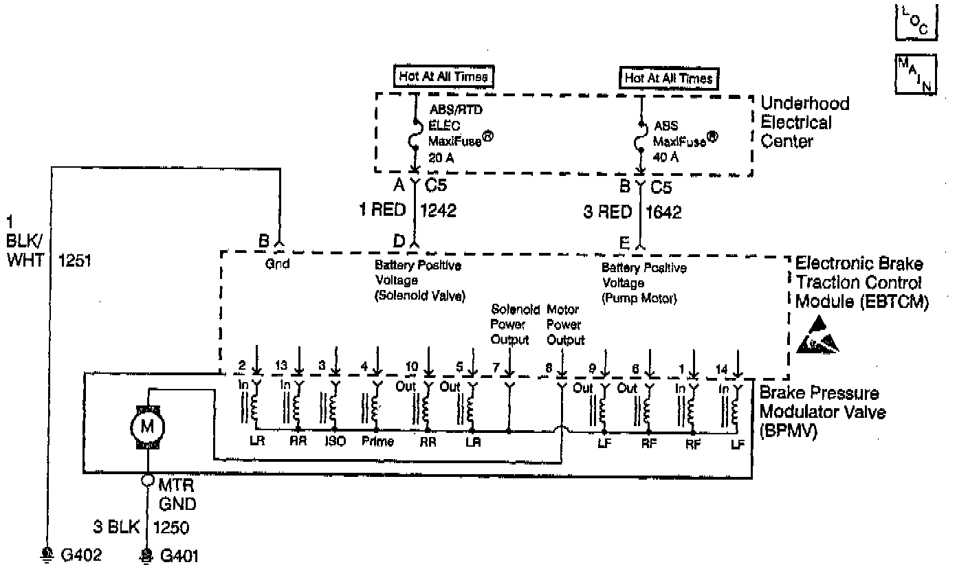 The solenoid valve relay supplies power to the solenoid valves in the BPMV. The solenoid valve relay, located in the EBTCM, is activated whenever the ignition switch is in the ON position and no faults are present. Power is provided to the solenoid valves through the relay from CKT 1242 going into terminal D of the EBTCM. The solenoid valve relay remains engaged until the ignition is turned OFF or a failure is detected.
