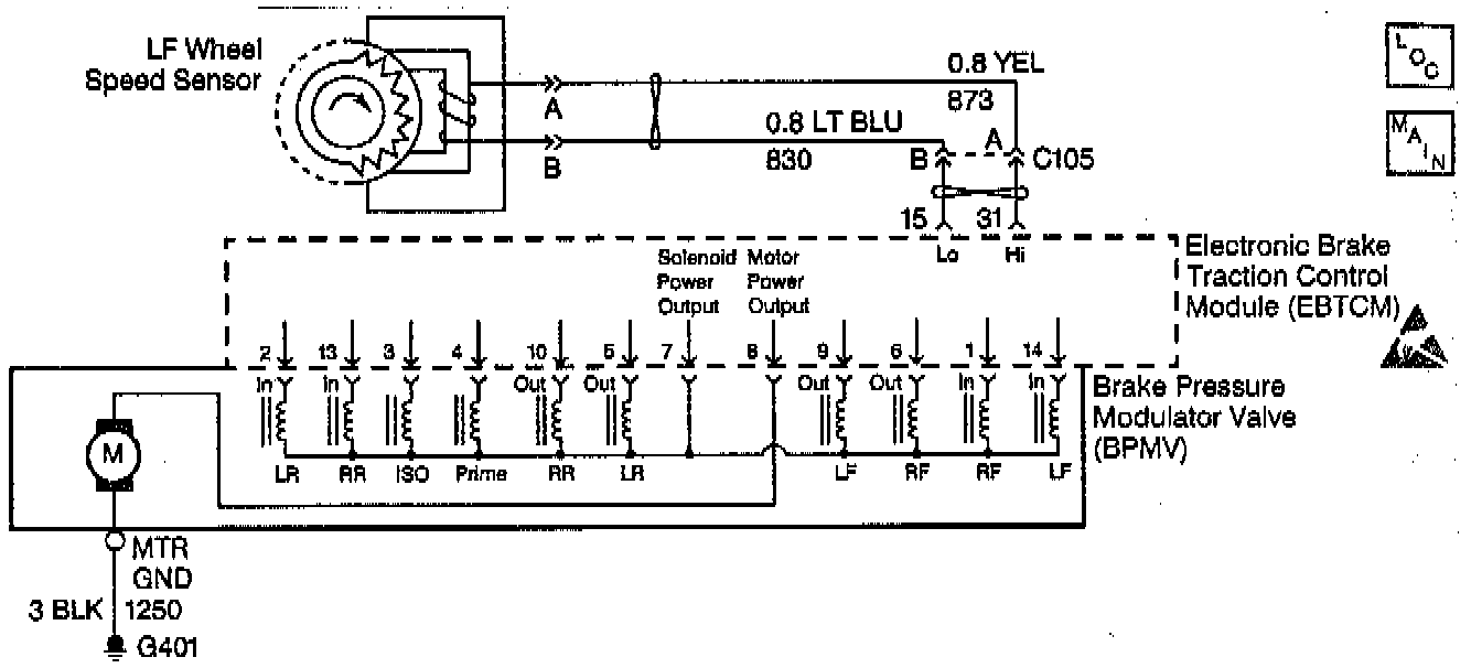 The speed sensor used on this vehicle is a single point magnetic pickup. This sensor produces an AC signal that the EBTCM uses the frequency from to calculate the wheel speed.