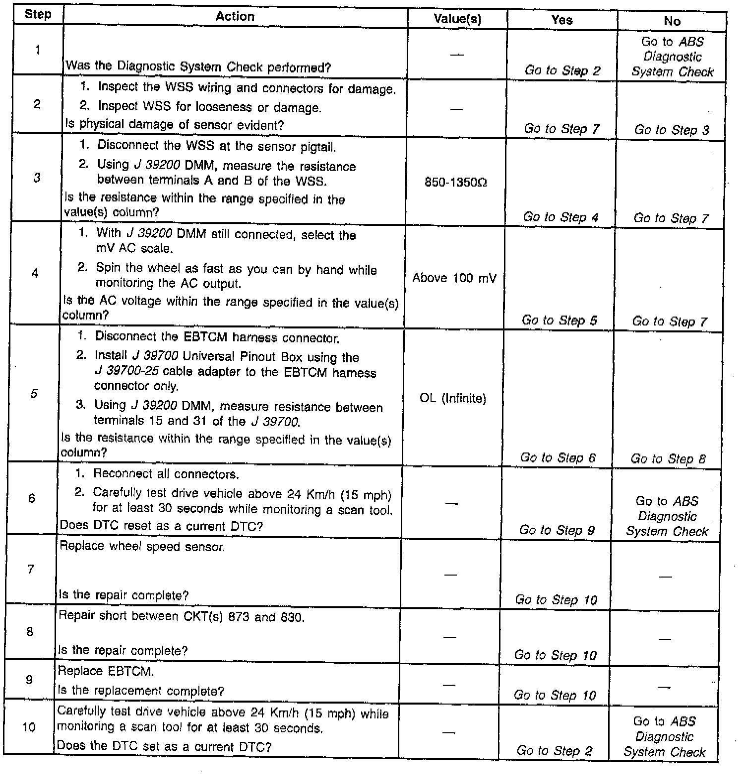 The DTC will set if one wheel speed = 0 and the other WSS are greater than 8 Km/h (5 mph) for 2.5 seconds.
