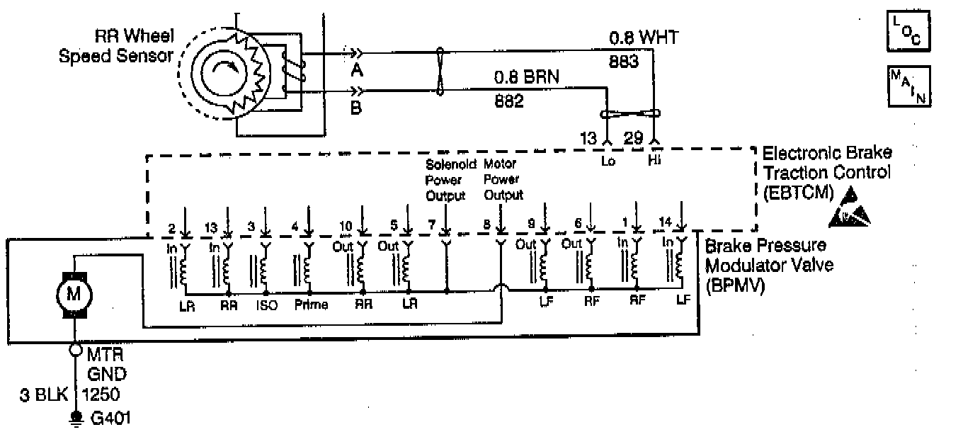The speed sensor used on this vehicle is a single point magnetic pickup. This sensor produces an AC signal that the EBTCM uses the frequency from to calculate the wheel speed.