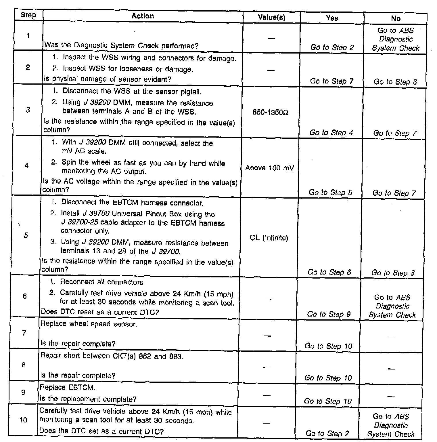 The DTC will set if one wheel speed = 0 and the other WSS are greater than 8 Km/h (5 mph) for 2.5 seconds.