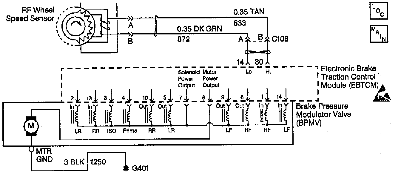 The speed sensor used on this vehicle is a single point magnetic pickup. This sensor produces an AC signal that the EBTCM uses the frequency from to calculate the wheel speed.