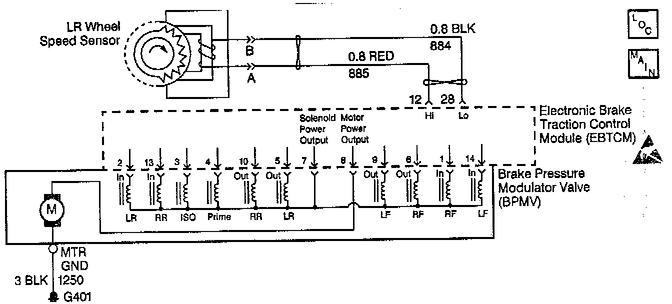 The speed sensor used on this vehicle is a single point magnetic pickup. This sensor produces an AC signal that the EBTCM uses the frequency from to calculate the wheel speed.