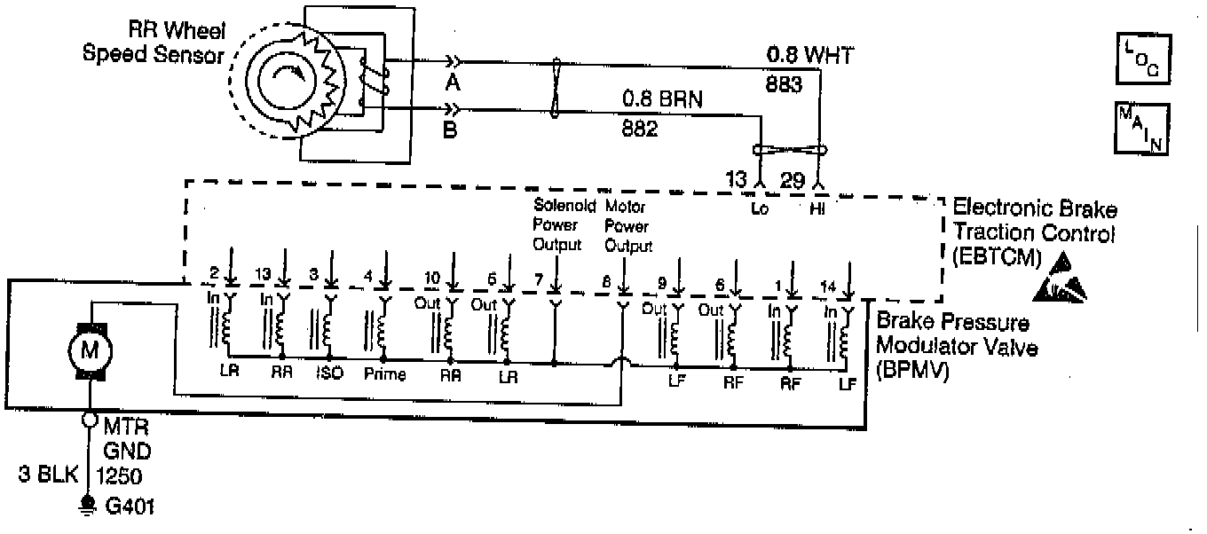 The speed sensor used on this vehicle is a single point magnetic pickup. This sensor produces an AC signal that the EBTCM uses the frequency from to calculate the wheel speed.