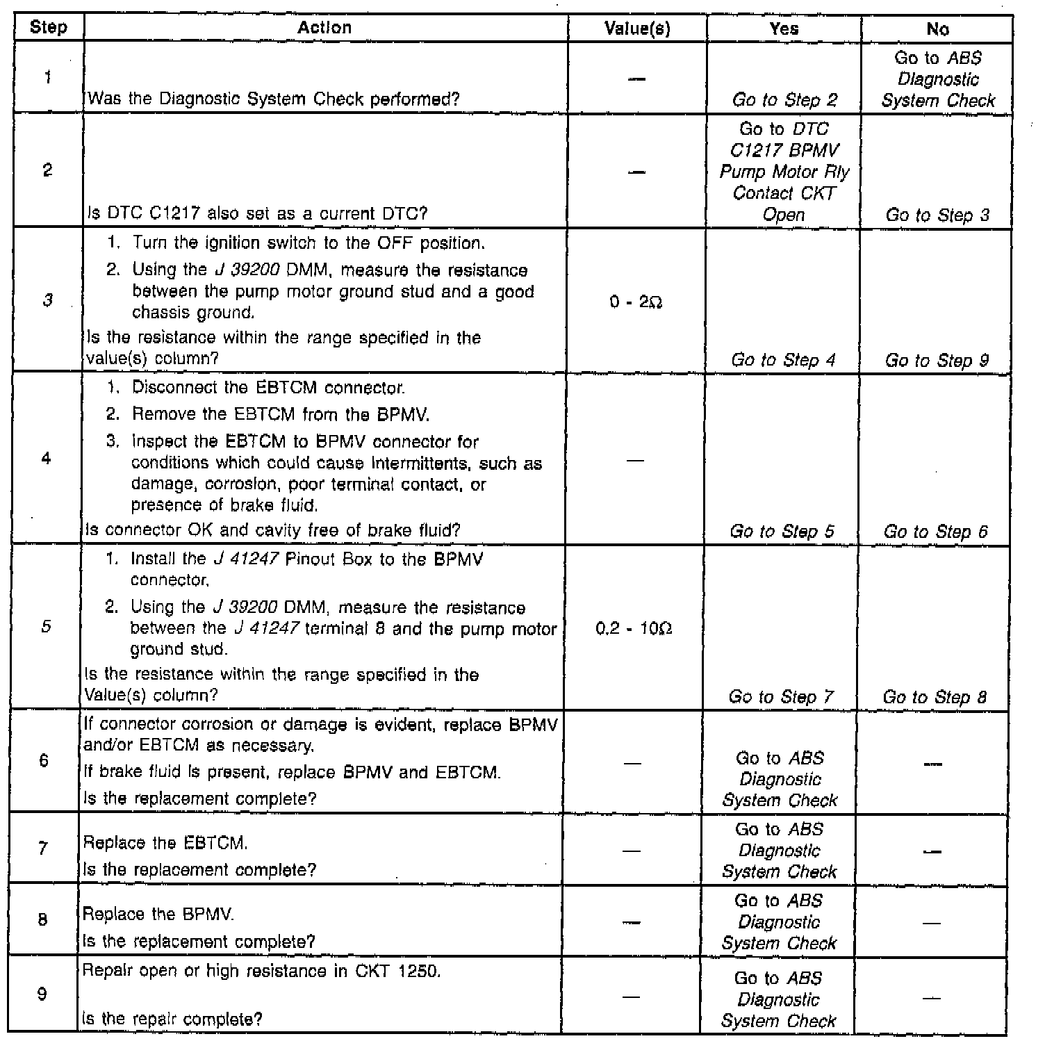 DTC C1243 can be set when the pump motor relay has been commanded OFF after the pump motor has been ON. A malfunction has occurred if the pump motor was ON, and the EBTCM sensed a stuck or slowly turning pump motor.