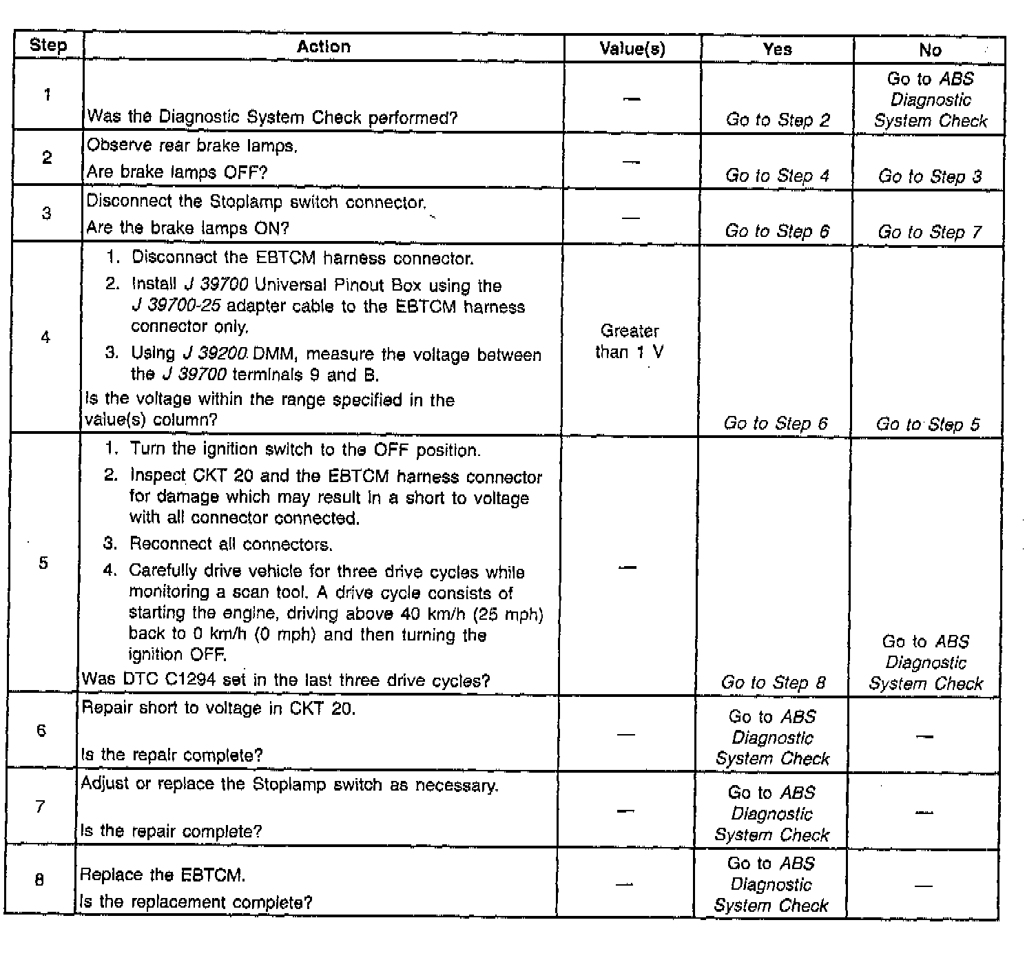 DTC C1294 can be set if the vehicle speed reaches at least 40 km/in (25 mph). If the brake was never OFF during two consecutive drive cycles, a malfunction exists.