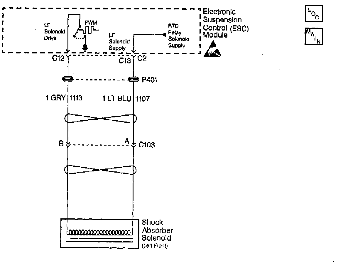 The ESC module uses the Pulse-Width Modulation (PWM) method in order to control each shock absorber solenoid. Switching the voltage ON and OFF at each shock absorber solenoid, or PWM-ing, limits the amount of current supplied to that particular solenoid. The ESC module periodically commands each shock absorber to an set PWM duty cycle in order to override the normal PWM command. During this set PWM duty cycle, the ESC module is able to perform a diagnostic test on each shock absorber solenoid, and can determine if a malfunction is present. The ESC module is only able to detect certain malfunctions during a given state (ON or OFF). In order to test for the conditions that set a DTC C1710, the ESC module must first command the LF solenoid ON. If a high voltage level is detected in the solenoid drive low circuit during the ON state, the test is again repeated. If the ESC module determines that the voltage levels detected in both tests are higher than expected, a malfunction is present and a DTC will set.