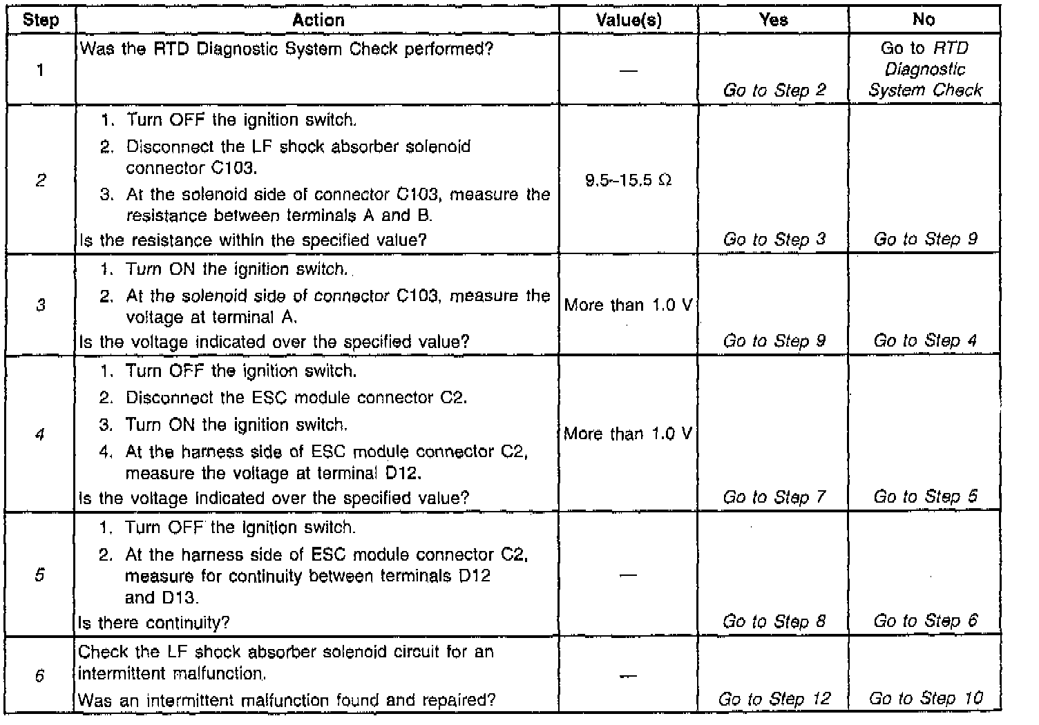 6. This step checks for an intermittent malfunction and requests a thorough inspection of the related LF shock absorber circuit wiring and connectors.