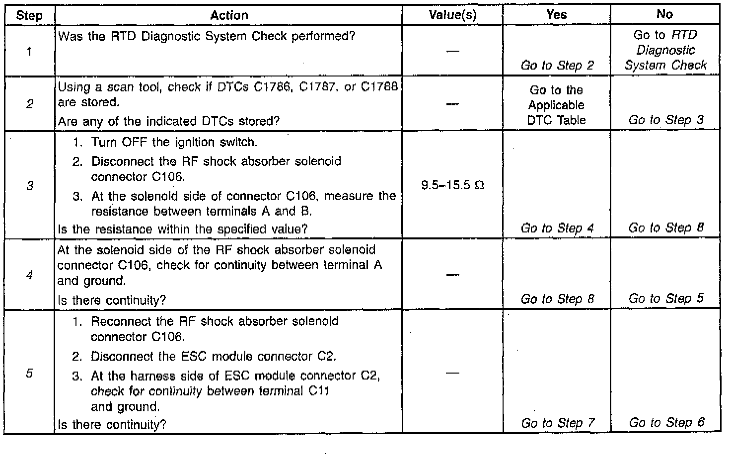 - The RTD relay provides supply voltage to all four shock absorber solenoids; therefore, multiple shock absorber solenoid (open or short to ground) DTCs may also be stored along with a DTC C1786. Always diagnose a DTC C1786 first before attempting to diagnose multiple shock absorber solenoid DTCs.