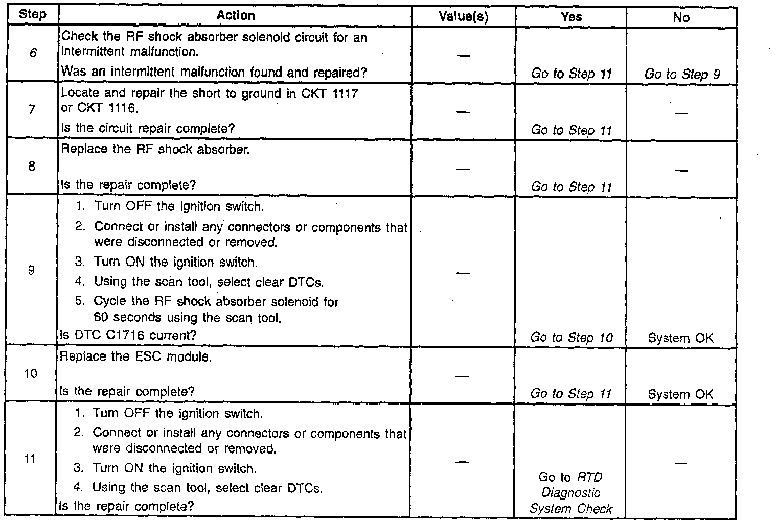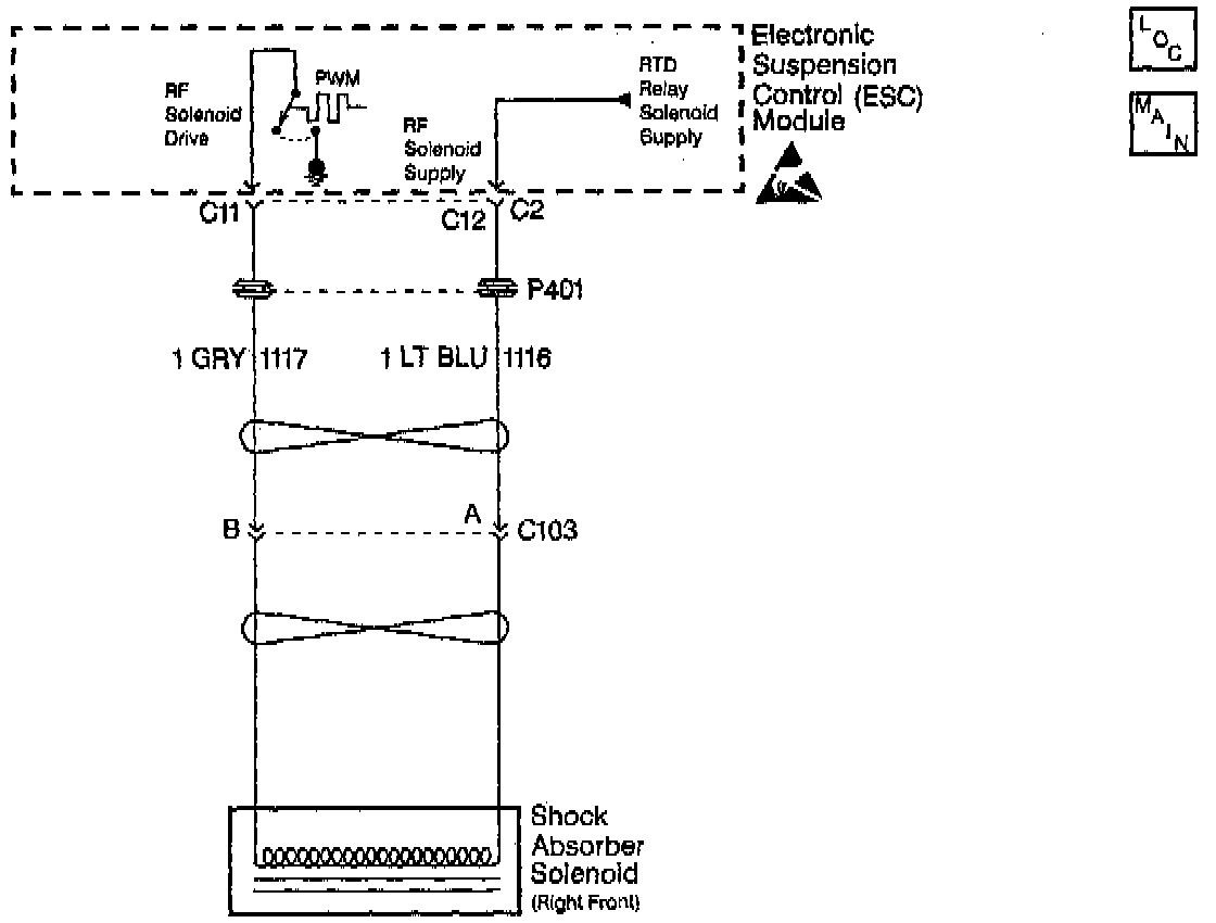 The ESC module uses the Pulse-Width Modulation (PWM) method in order to control each shock absorber solenoid. Switching the voltage ON and OFF at each shock absorber solenoid, or PWM-ing, limits the amount of current supplied to that particular solenoid. The ESC module periodically commands each shock absorber to an set PWM cycle in order to override the normal PWM command. During this set PWM duty cycle, the ESC module is able to perform a diagnostic test on each shock absorber solenoid, and can determine if a malfunction is present. The ESC module is only able to detect certain malfunctions during a given state (ON or OFF). In order to test for the conditions that set a DTC C1716, the ESC module must first command the RF solenoid OFF. The ESC module must be in a command OFF state. If a low voltage level is detected in the solenoid drive low circuit during the OFF state, the test is again repeated. If the ESC module determines that the voltage levels detected in both tests are lower than expected, a malfunction is present and a DTC will set.