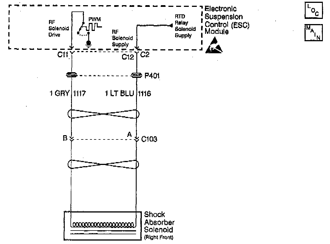 The ESC module uses the Pulse-Width Modulation (PWM) method in order to control each shock absorber solenoid. Switching the voltage ON and OFF at each shock absorber solenoid, or PWM-ing, limits the amount of current supplied to that particular solenoid. The ESC module periodically commands each shock absorber to an set PWM duty cycle in order to override the normal PWM command. During this set PWM duty cycle, the ESC module is able to perform a diagnostic test on each shock absorber solenoid, and can determine if a malfunction is present. The ESC module is only able to detect certain malfunctions during a given state (ON or OFF). In order to test for the conditions that set a DTC C1717, the ESC module must first command the RF solenoid OFF. The ESC module must be in a command OFF state. If a low voltage level is detected in the solenoid drive circuit during the OFF state, the test is again repeated. If the ESC module determines that the voltage levels detected in both tests are lower than expected, a malfunction is present and a DTC will set.
