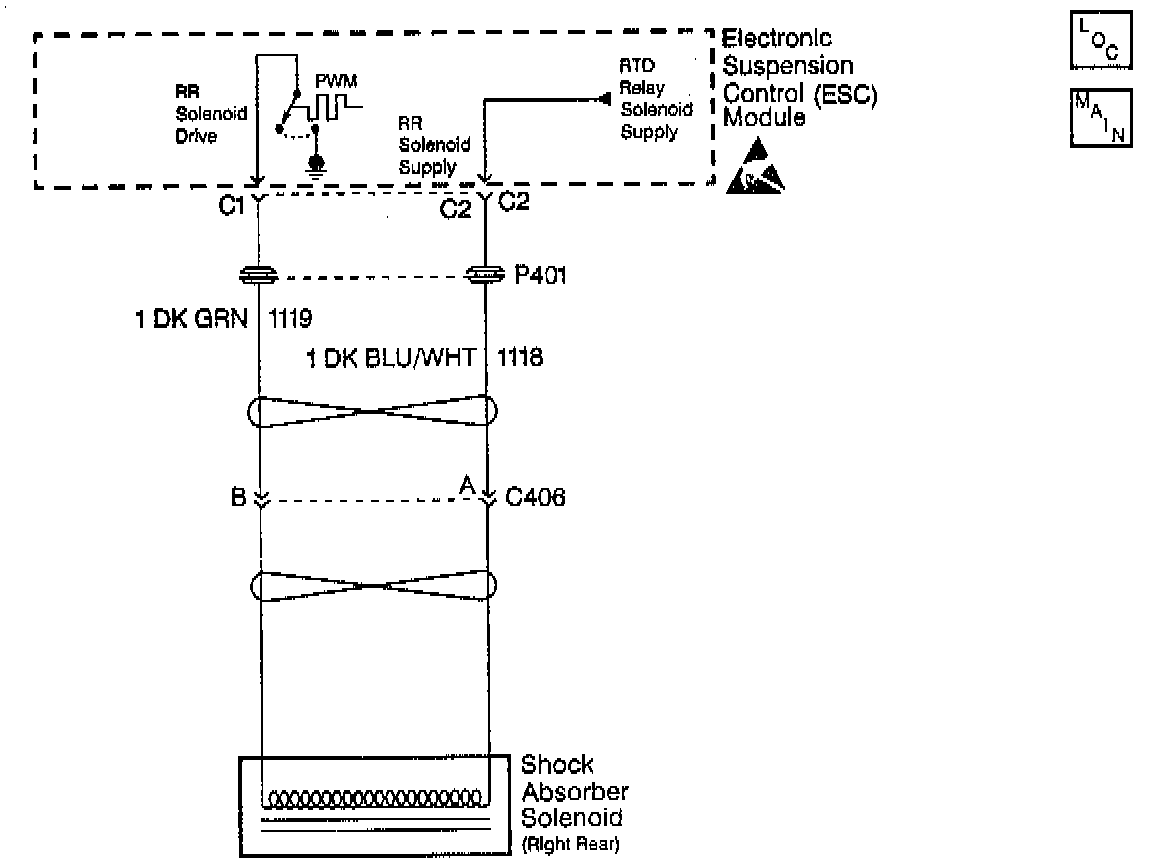 The ESC module uses the Pulse-Width Modulation (PWM) method in order to control each shock absorber solenoid. Switching the voltage ON and OFF at each shock absorber solenoid, or PWM-ing, limits the amount of current supplied to that particular solenoid. The ESC module periodically commands each shock absorber to an set PWM duty cycle in order to override the normal PWM command. During this set PWM duty cycle, the ESC module is able to perform a diagnostic test on each shock absorber solenoid, and can determine if a malfunction is present. The ESC module is only able to detect certain malfunctions during a given state (ON or OFF). In order to test for the conditions that set a DTC C1727, the ESC module must first command the RR solenoid OFF. The ESC module must be in a command OFF state. If a low voltage level is detected in the solenoid drive circuit during the OFF state, the test is again repeated. If the ESC module determines that the voltage levels detected in both tests are lower than expected, a malfunction is present and a DTC will set.