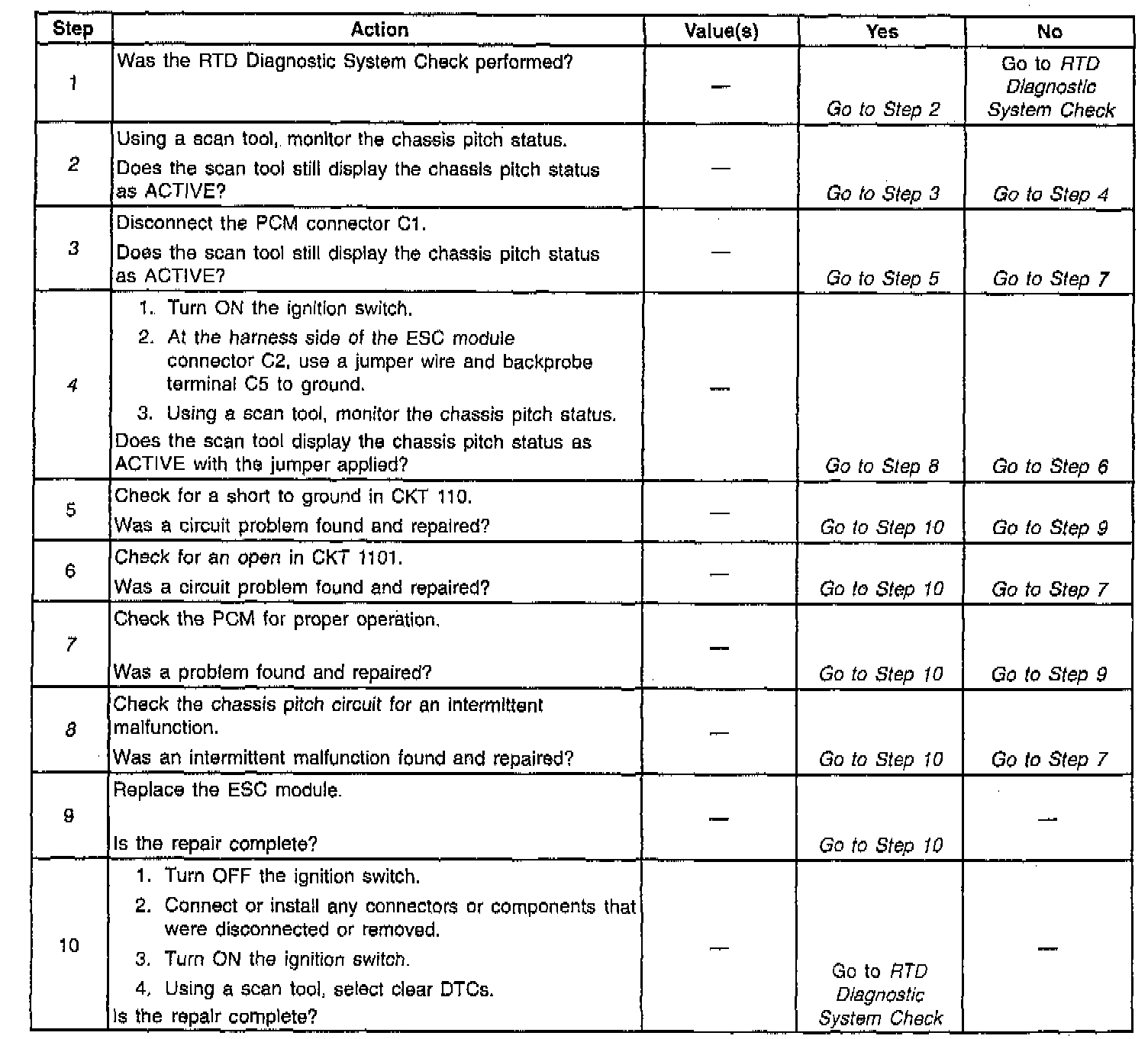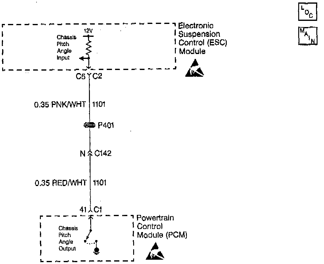 The ESC module receives a chassis input from the PCM on CKT 1101. Under normal conditions, this signal is battery voltage. The PCM then grounds this circuit when the vehicle is accelerating rapidly or braking hard. When the chassis pitch input circuit goes low (about 0 volts), the ESC module commands all four shock absorber solenoids to a firm position. The PCM calculates the chassis pitch information based on the engine torque and the vehicle braking force. Once the ignition switch is turned to RUN, the ESC module sends a chassis pitch request to the PCM on the serial data line. The PCM then grounds the chassis pitch input circuit (pulling the circuit low for 5 seconds) and returns to normal operation.