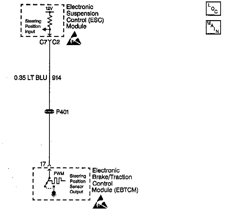 The ESC module receives a PWM steering position signal from the EBTCM on CKT 914. The ESC module uses this signal in order to determine the shock absorber control levels and will command a more firm setting if the vehicle is in a turn. The ESC module monitors the steering position circuit and can determine if a valid signal is sent from the EBTCM.