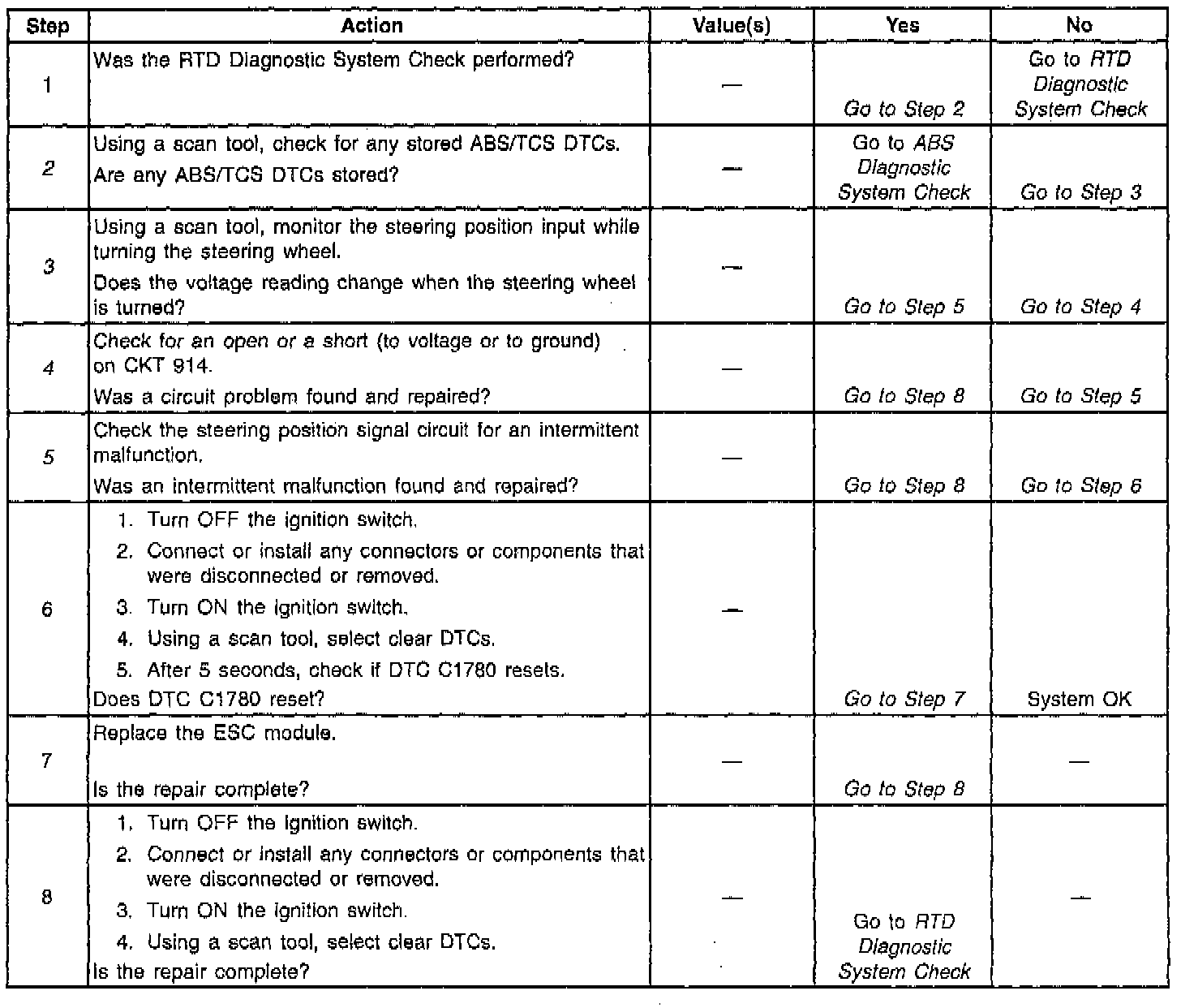2. This step checks if any ABS/TCS DTCs are present. The EBTCM provides the ESC module with steering position data, therefore all ABS/TCS DTCs that are associated with the steering position sensor must be diagnosed and corrected before attempting to diagnose a DTC C1780.