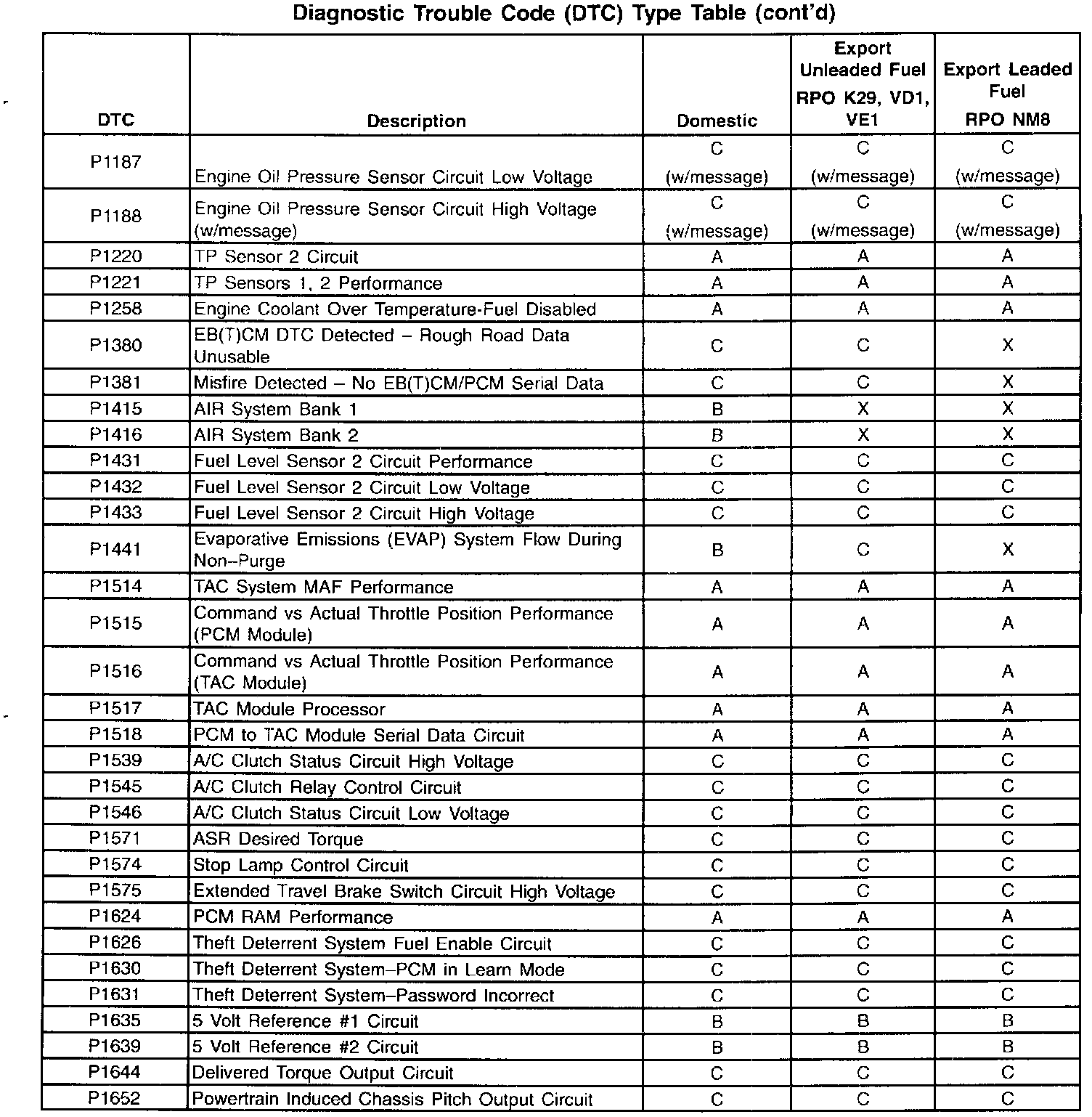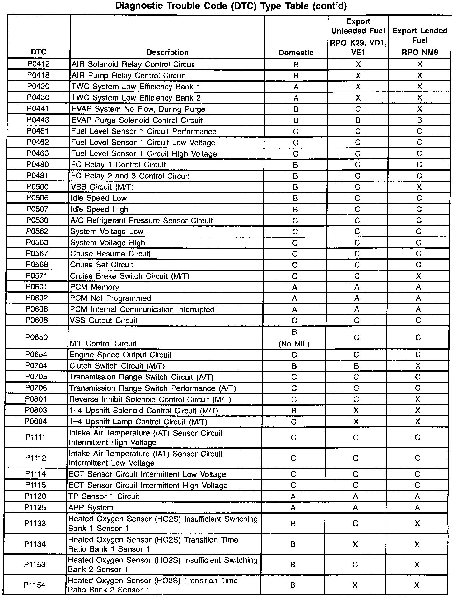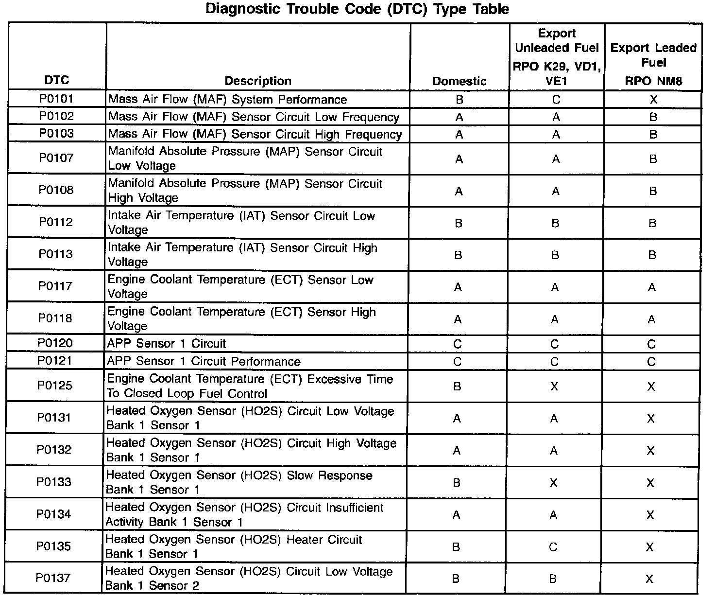 The service information contained in herein refers to the Federal calibration package. The export change is NOT reflected in the service information on the DTC's diagnostic support information data or in the Repair Instructions. The DTC Type table information refers to domestic and Export calibration packages. Export vehicles may have differences in DTC types that will affect Malfunction Indicator Lamp (MIL) operation. Certain DTCs have been changed from type A to type C or, in some cases, type X. When a type A diagnostic fails, a DTC is set immediately and the Malfunction Indicator Lamp (MIL) is illuminated. When a type B DTC diagnostic fails, the Malfunction Indicator Lamp (MIL) will illuminate if the fault is present after two consecutive drive trips. A type C DTC will set after one failure and be stored in history but will not illuminate the Malfunction Indicator Lamp (MIL). For certain DTCs, a message will also appear on the Driver Information Center (DIC). Type X DTCs have been turned off (the diagnostic does not run, no codes are stored, and the Malfunction Indicator Lamp (MIL) will not illuminate.