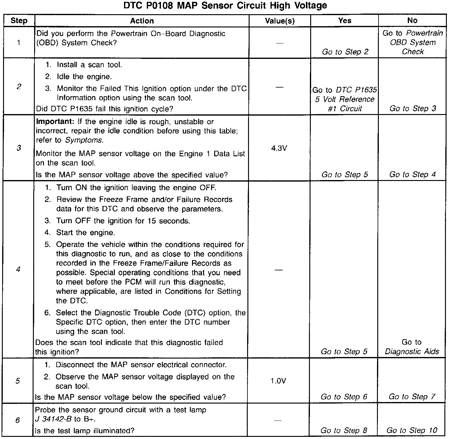 The MAP sensor voltage (depending on altitude) can range from 1.0-1.5 volts at idle (high vacuum) to 4.0 - 4.9 volts at wide open throttle (low vacuum). When the PCM senses a signal voltage higher than the normal operating range of the sensor, this DTC will set.