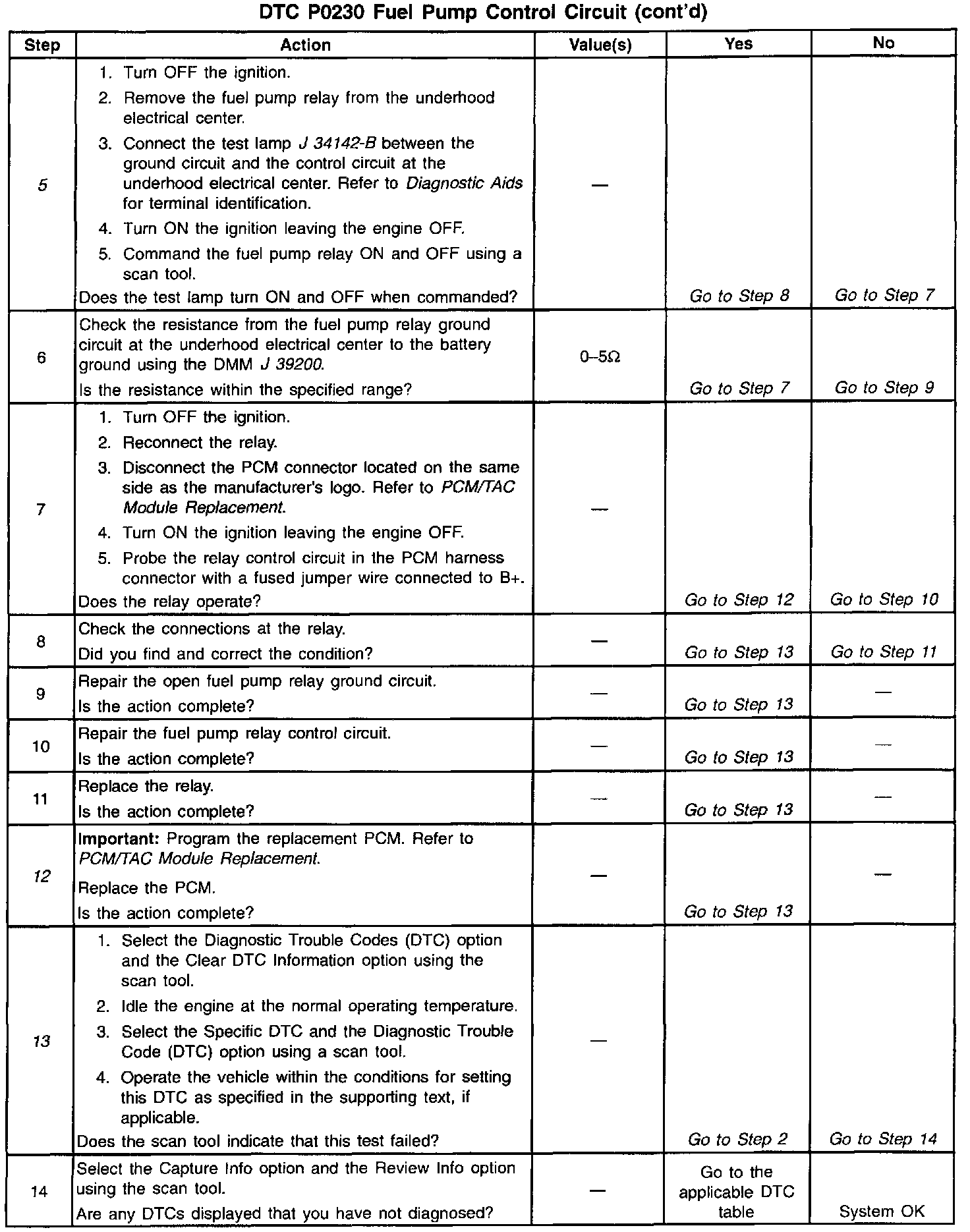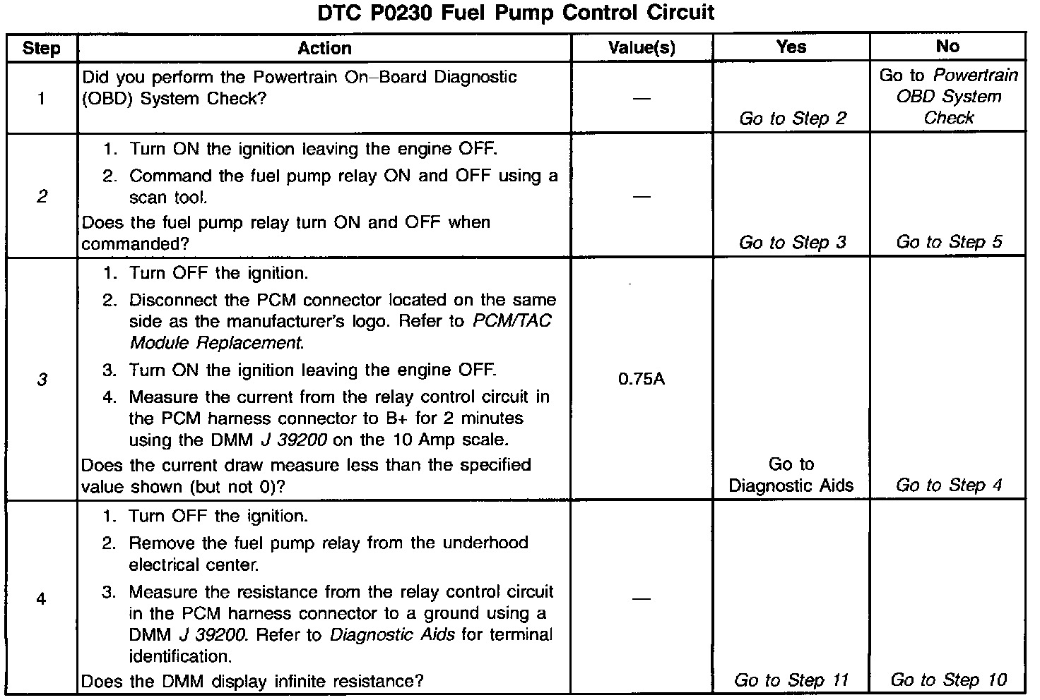 If there are no reference pulses, the PCM turns the fuel pump off after about 2-3 seconds. The PCM controls the fuel pump relay by applying B+ to the control circuit via an internal switch called a driver. The primary function of the driver is to supply a voltage to the fuel pump relay. The driver has a fault line which the PCM monitors. When the PCM commands the fuel pump on, the voltage of the control circuit should be high (near battery voltage). When the PCM commands the control circuit to the fuel pump OFF, the voltage potential of the circuit should be low (near 0 volts). This DTC sets when the PCM detects the fuel pump control circuit is shorted to ground.