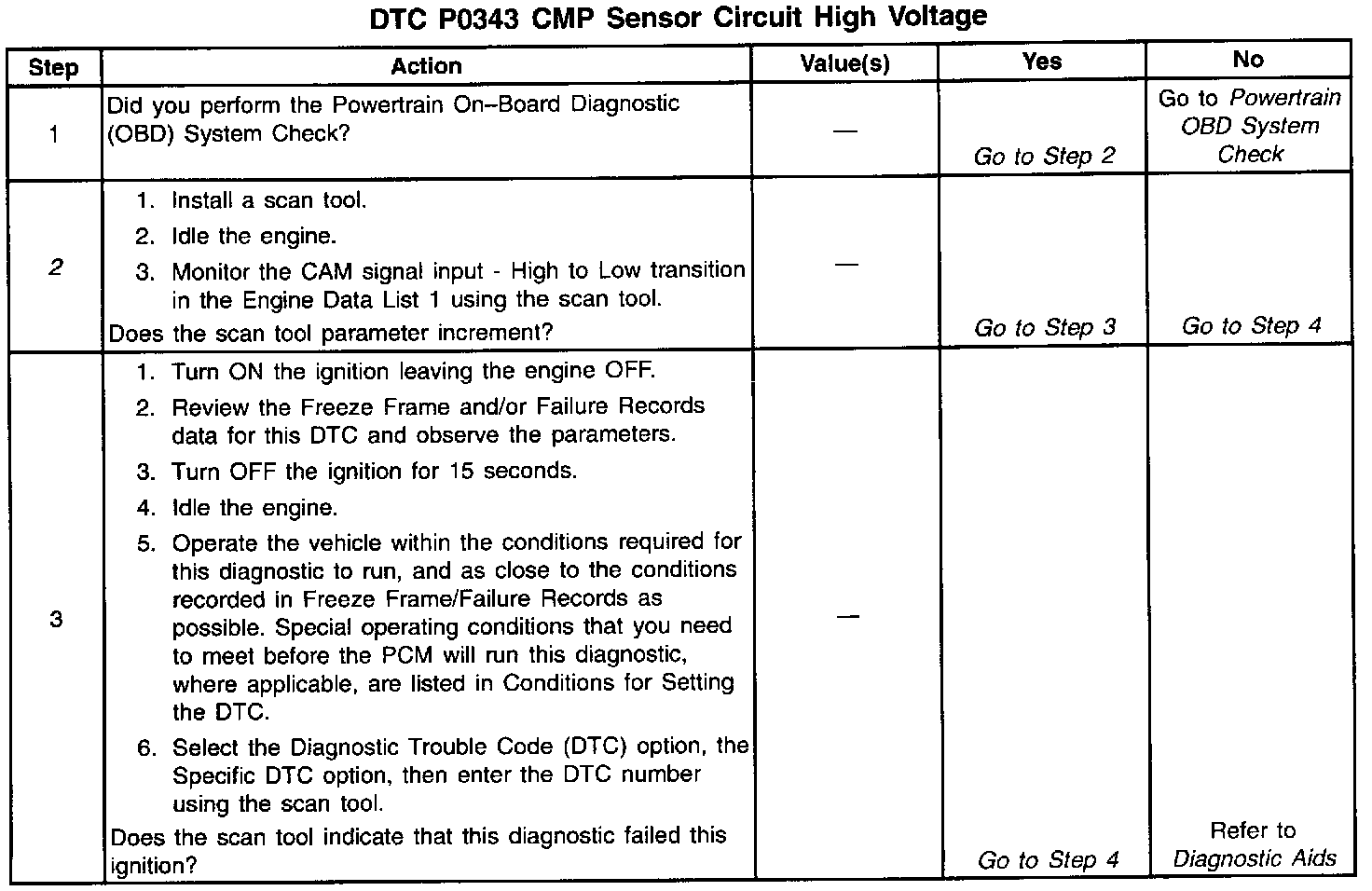 The CMP sensor determines whether a cylinder is on a firing stroke or on an exhaust stroke. As the camshaft rotates, the reluctor wheel interrupts a magnetic field produced by a magnet within the sensor. The sensors internal circuitry detects this and produces a signal which the PCM reads. The PCM uses this 1x signal in combination with the Crankshaft Position sensor 24X signal in order to determine crankshaft position and stroke. This diagnostic for the Camshaft Position sensor checks for a loss of Camshaft Position sensor signal.