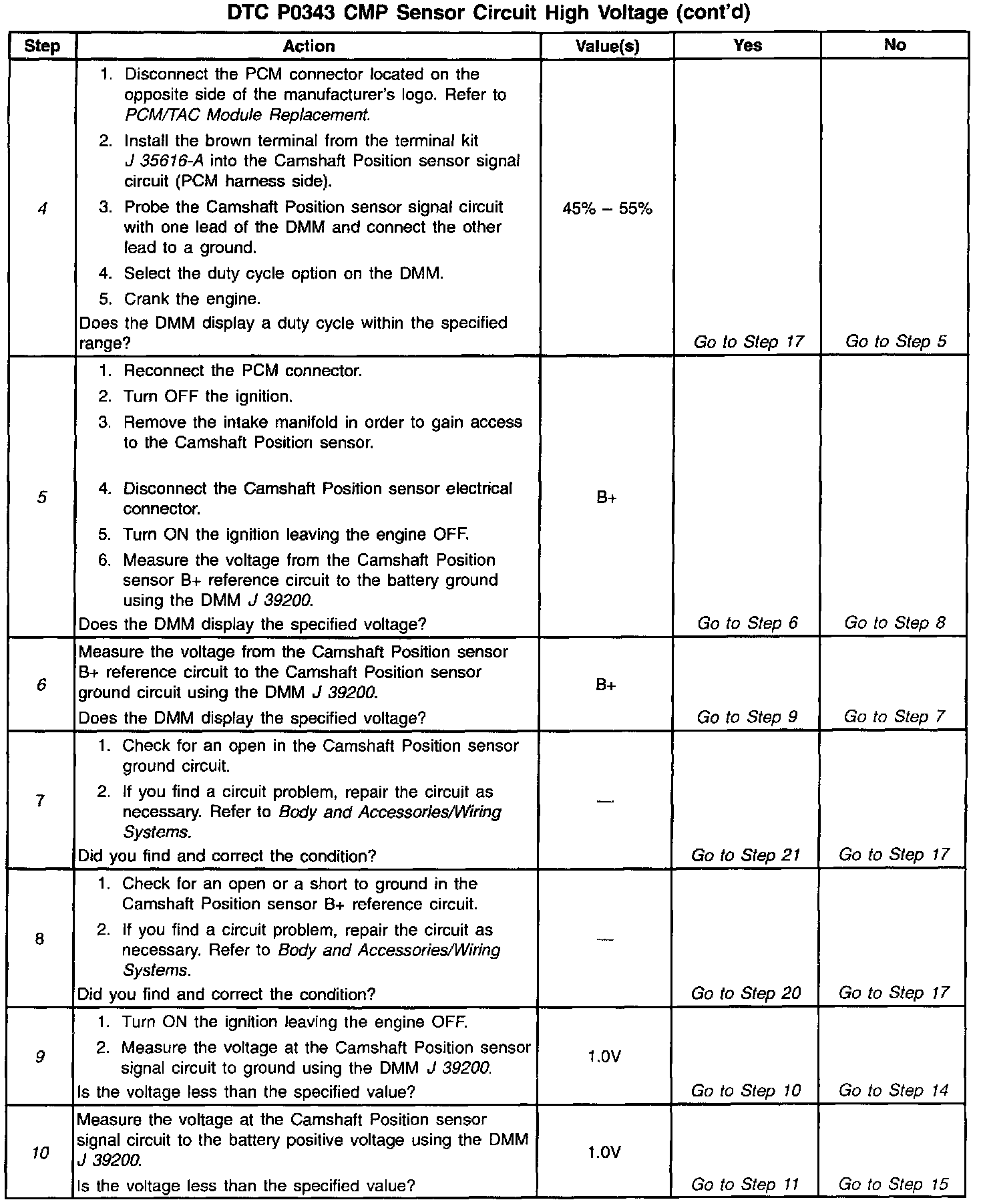 9. This step checks for a short to B+ on the Camshaft Position sensor signal circuit.