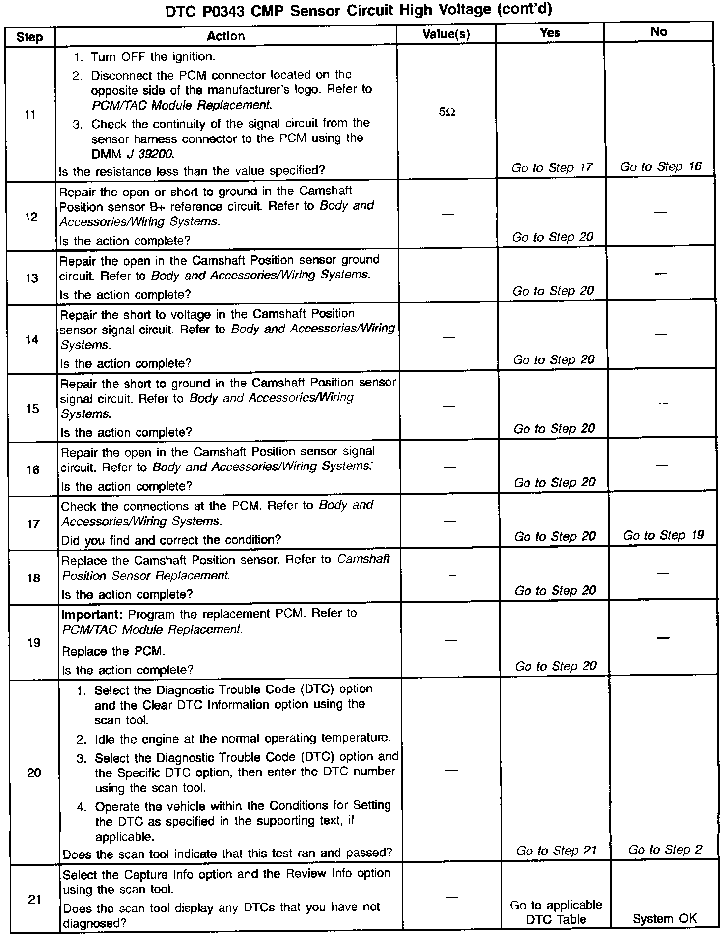 10. This step checks for a short to ground on the Camshaft Position sensor signal circuit.