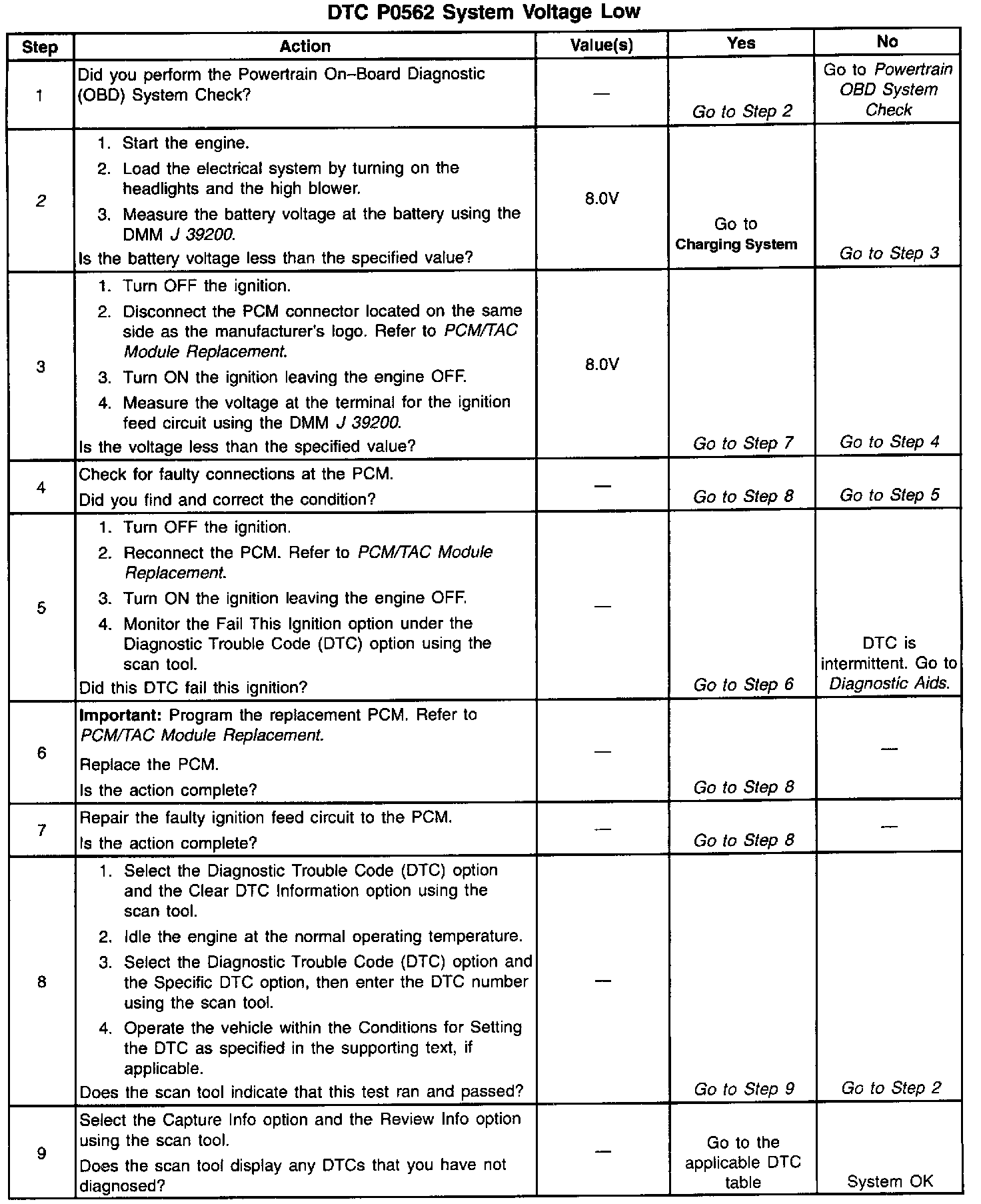 ^ An extremely low voltage (below 7.5 volts) may cause the loss of serial data and the MIL may not function. An open ignition feed circuit causes a no start and the MIL will not illuminate. A low system voltage may cause other DTCs to set.