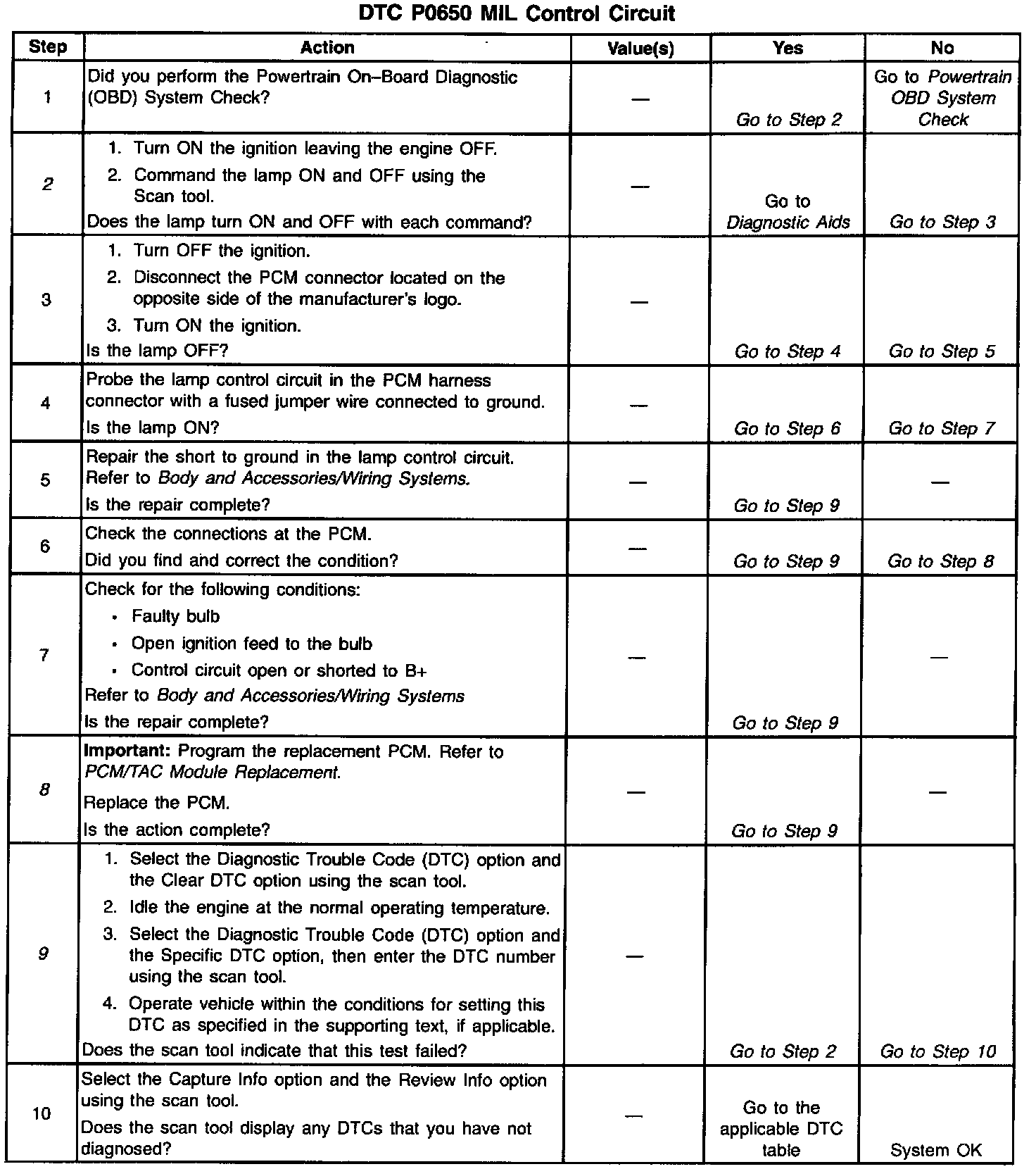 ^ The PCM will not command the MIL ON. The PCM stores DTC P0650 in memory when the diagnostic runs and fails.