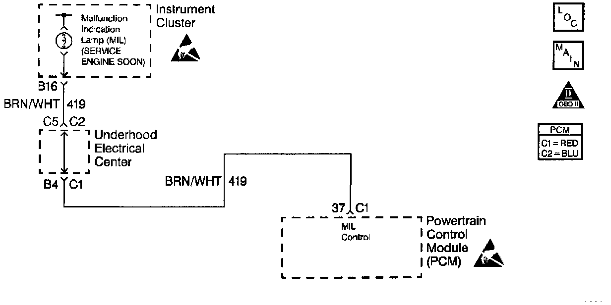 Ignition voltage is supplied directly to the Malfunction Indicator Lamp. The PCM controls the lamp by grounding the control circuit via an internal switch called a driver. The primary function of the driver is to supply the ground for the component being controlled. Each driver has a fault line which is monitored by the PCM. When the PCM is commanding a component ON, the voltage of the control circuit should be low (near 0.0 volts). When the PCM is commanding the control circuit to a component OFF, the voltage potential of the circuit should be high (near battery voltage). If the fault detection circuit senses a voltage other than what is expected, the fault line status will change causing the DTC to set.