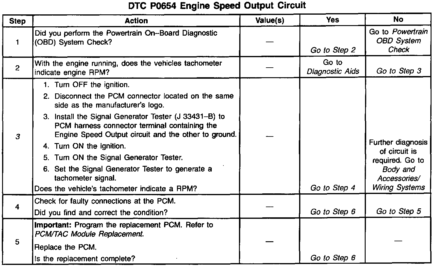 3. Further circuit diagnosis may require I/P removal. Check the circuit from the PCM to the tachometer for being open, shorted to ground or, voltage. If you can not find any trouble, follow the appropriate I/P diagnostic procedure.