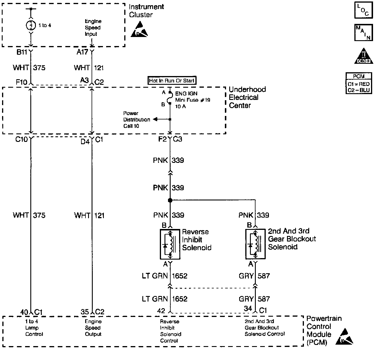 The ENG IGN mini fuse supplies an ignition voltage directly to the 2nd Gear Block out solenoid coil. The PCM controls the solenoid by grounding the control circuit via an internal switch called a driver. The driver supplies the ground for the component being controlled. Each driver has a fault line which the PCM monitors. When the PCM commands a component ON, the voltage of the control circuit should be low (near 0.0 volts). When the PCM commands the control circuit to a component OFF, the voltage potential of the circuit should be high (near battery voltage). If the fault detection circuit senses a voltage other than what is expected, the fault line status changes causing the DTC to set.