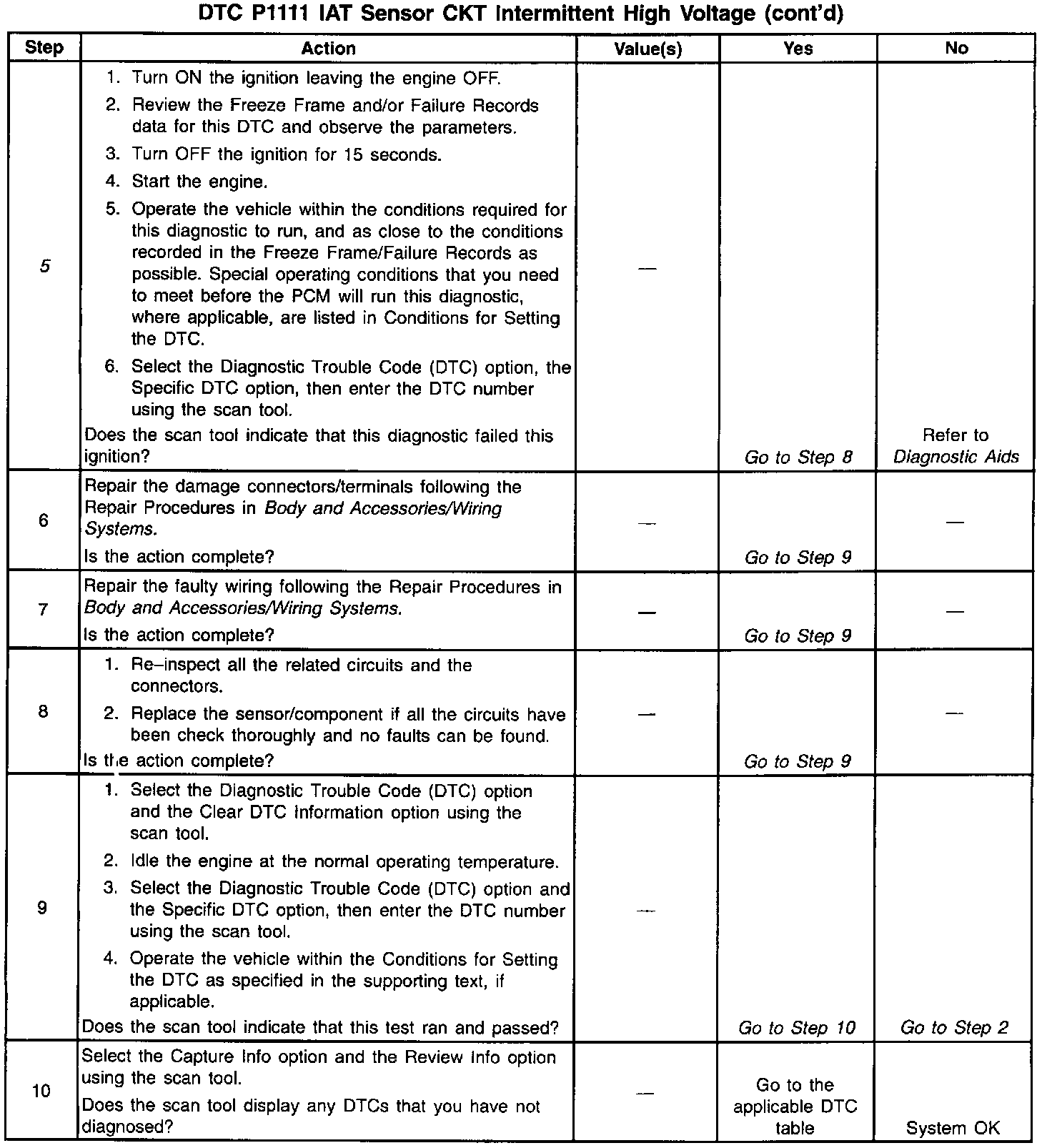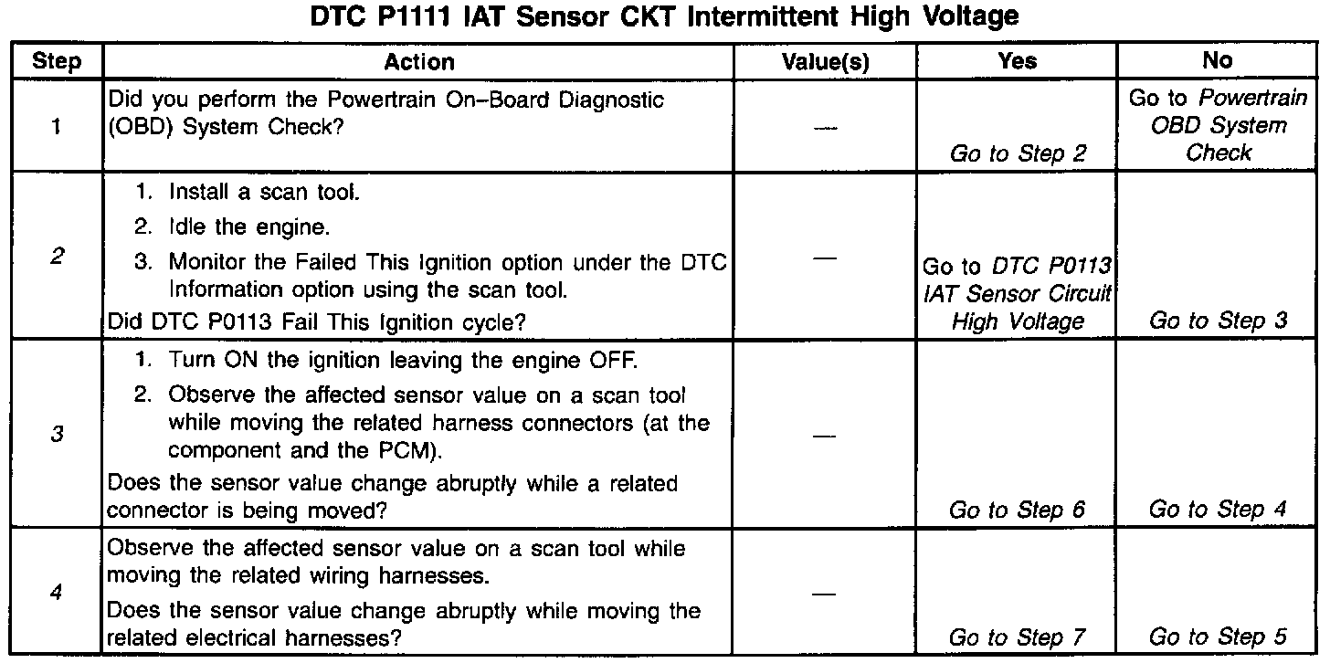 When the intake air is cold, the sensor (thermistor) resistance is high, and the PCMs signal voltage is only pulled down a small amount through the sensor to ground. The PCM senses a high signal voltage (low temperature). When the intake air is warm, the sensor resistance is low, and the signal voltage is pulled down a greater amount. This causes the PCM to sense a low signal voltage (high temperature). When the PCM senses a signal voltage higher than the normal operating range of the sensor, this DTC sets.