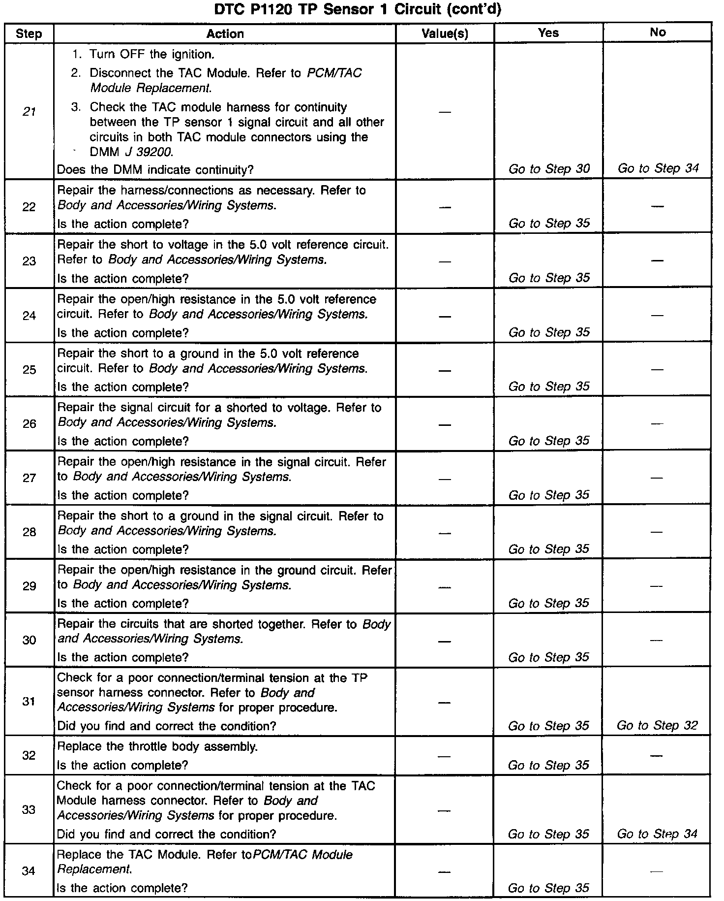 21. The previous step found the signal circuit and a 5.0 volt reference circuit shorted together. This test isolates whether the short is in the harness or within the TAC Module.