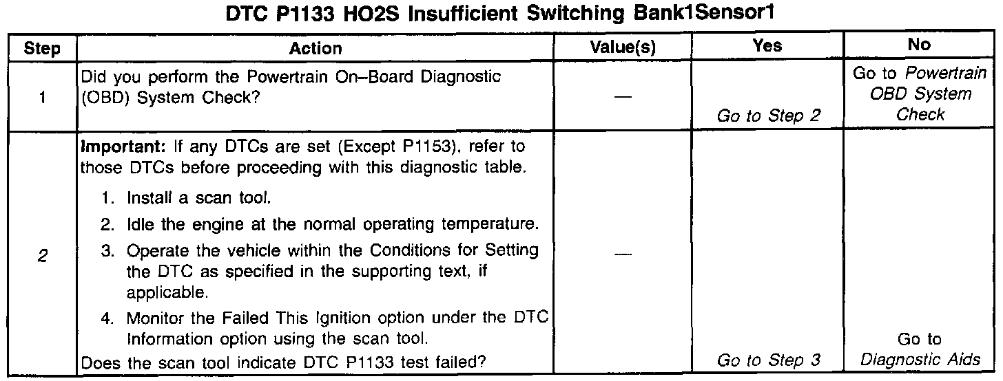 The PCM monitors the Heated Oxygen Sensor (HO2S) activity for 100 seconds. During this monitor period the PCM counts the number of times that the HO2S switches from rich to lean and lean to rich. When the PCM determines that the HO2S did not switch enough times, a DTC P1133 will set.