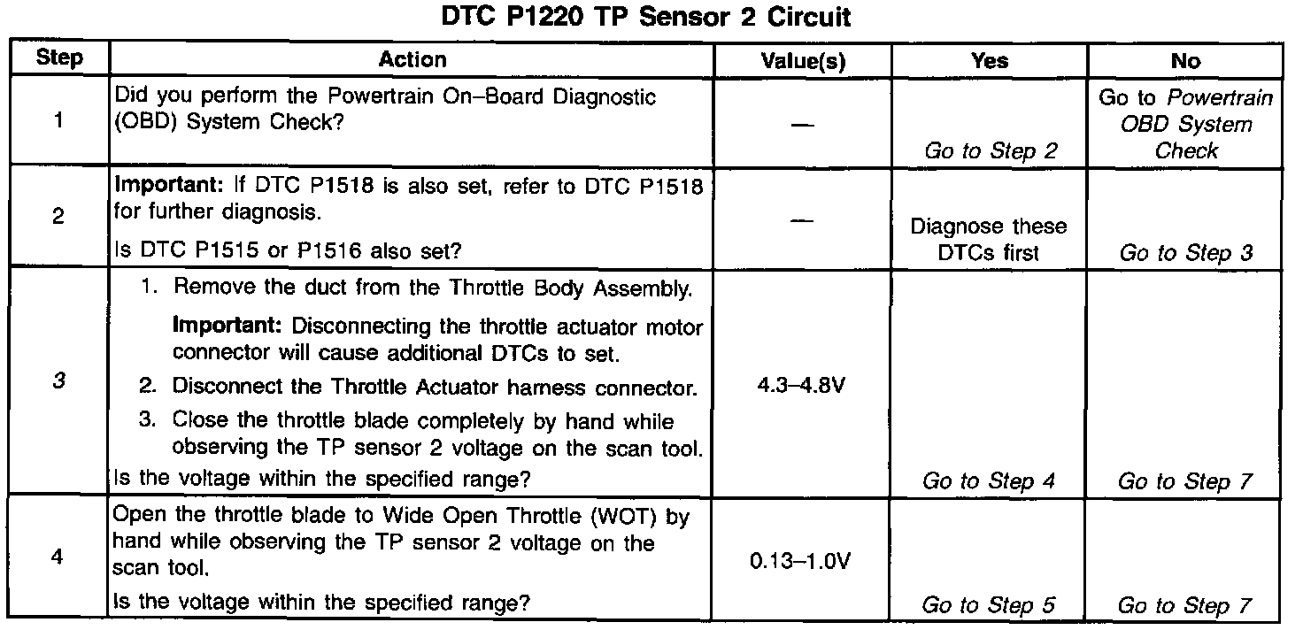 The Throttle Position (TP) sensor is mounted on the throttle body assembly. The sensor is actually two individual Throttle Position sensors within one housing. Two separate signal, ground and 5.0 volt reference circuits are used to connect the TP sensor assembly and the Throttle Actuator Control (TAC) Module. The two sensors have opposite functionality. The TP sensor 1 signal voltage increases as the throttle opens, from below 1.1 volts at 0% throttle to above 3.7 volts at 100% throttle. The TP sensor 2 signal voltage decreases from above 3.9 volts at 0% throttle to below 1.2 volts at 100% throttle. Observe also that the signal circuit for TP Sensor 1 is pulled up to 5.0 volts and that the signal circuit for TP Sensor 2 is pulled to ground within the TAC Module.
