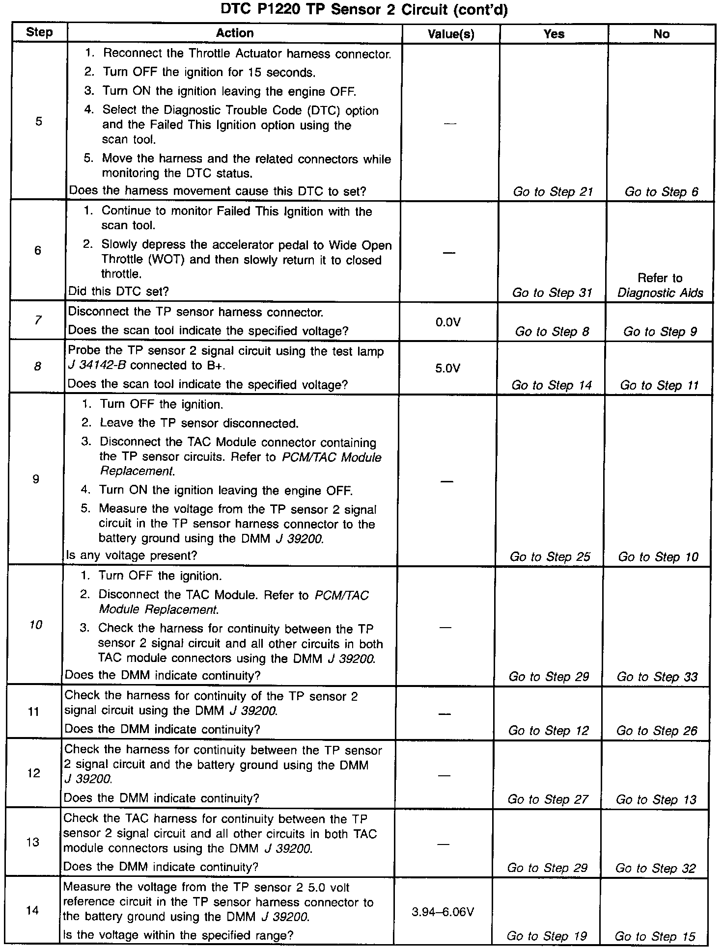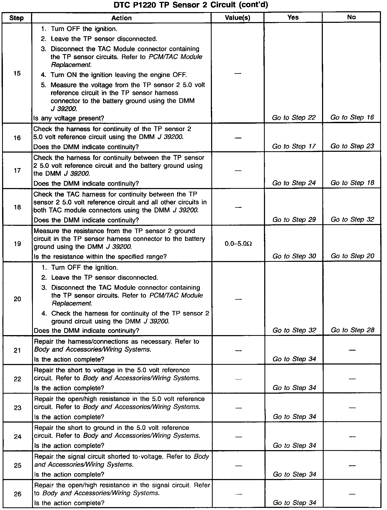 10. The previous step found no voltage present on the signal circuit with the TP sensor harness disconnected at both ends. This rules out a short to voltage from outside the TAC System. This test isolates whether the short is to another TAC System circuit in the harness or within the TAC Module.