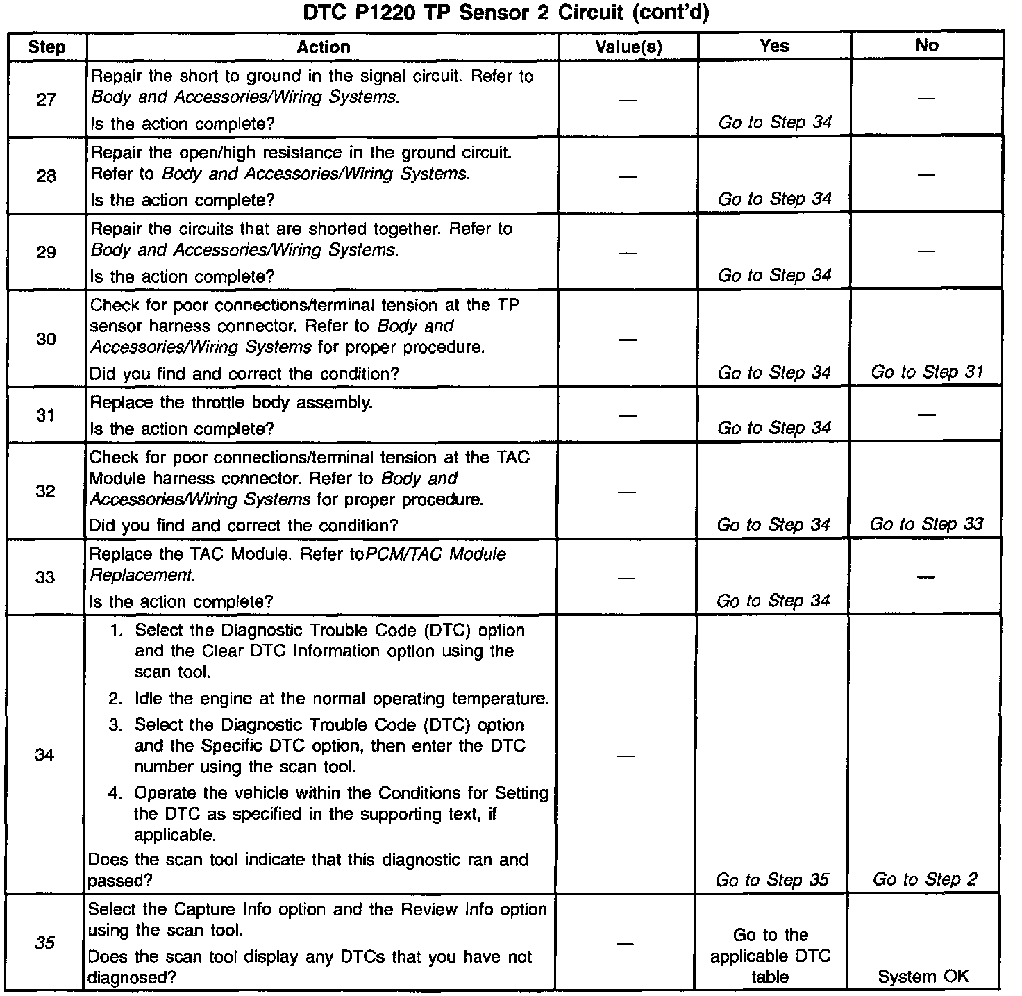 35. When the TAC module detects a problem within the TAC System, more than one TAC System related DTC may set. This is due to the many redundant tests run continuously on this system. Locating and repairing one individual problem may correct more than one DTC. Keep this in mind when reviewing captured DTC info.