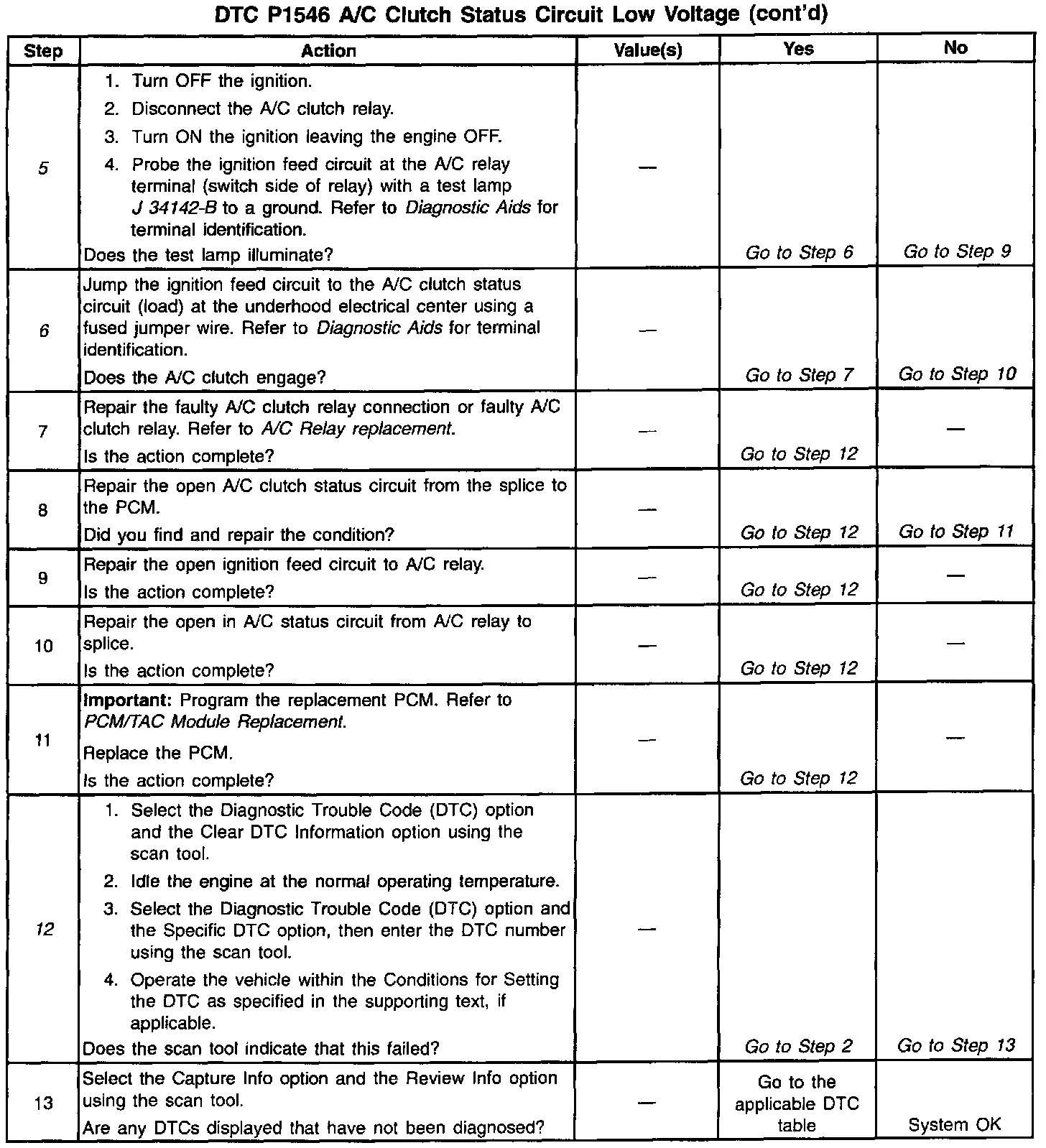 The PCM will activate the A/C clutch relay when the PCM detects that A/C has been requested. When the PCM activates the relay, voltage should be present at both the A/C compressor clutch and the A/C clutch status circuit at the PCM.