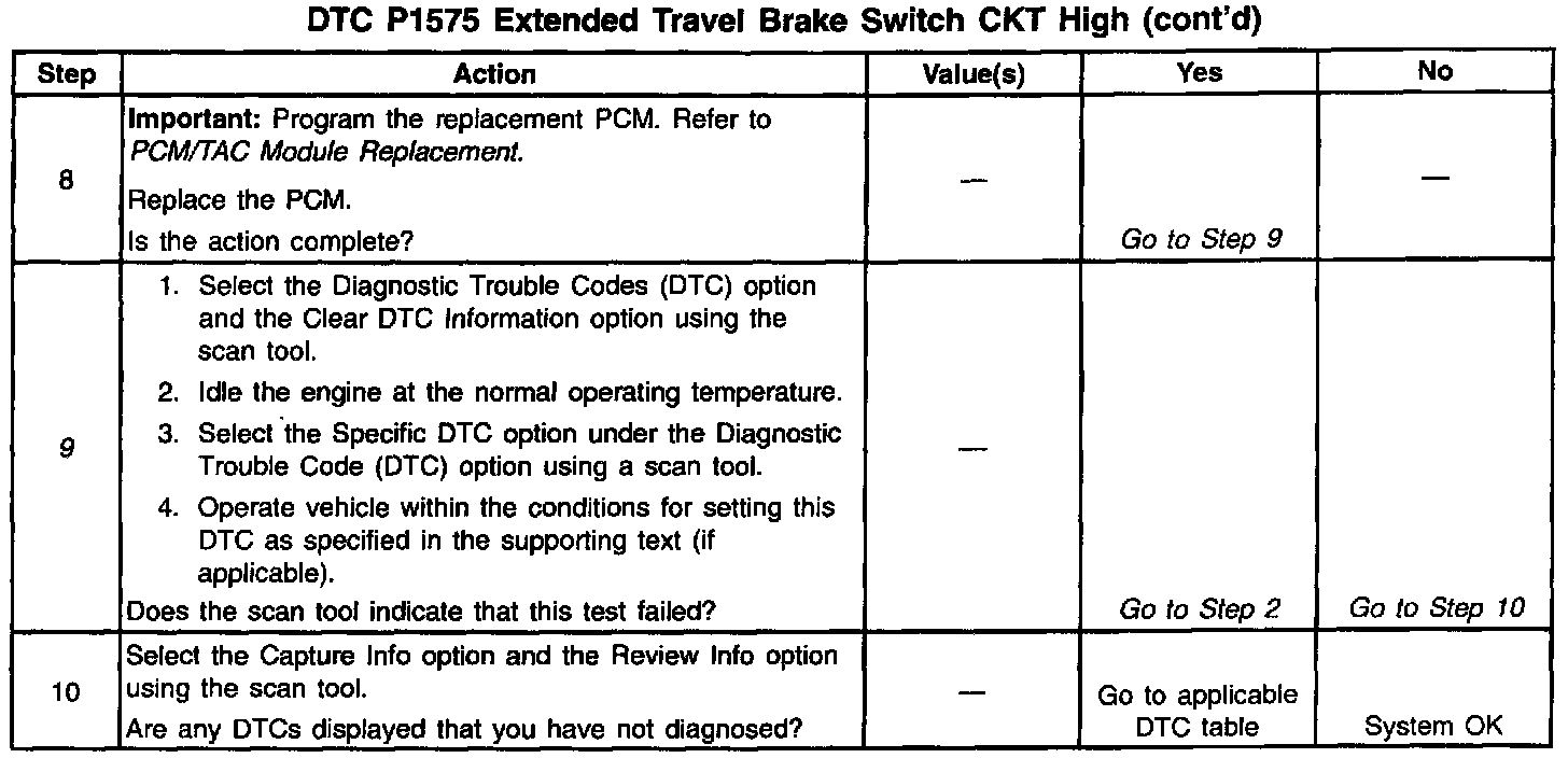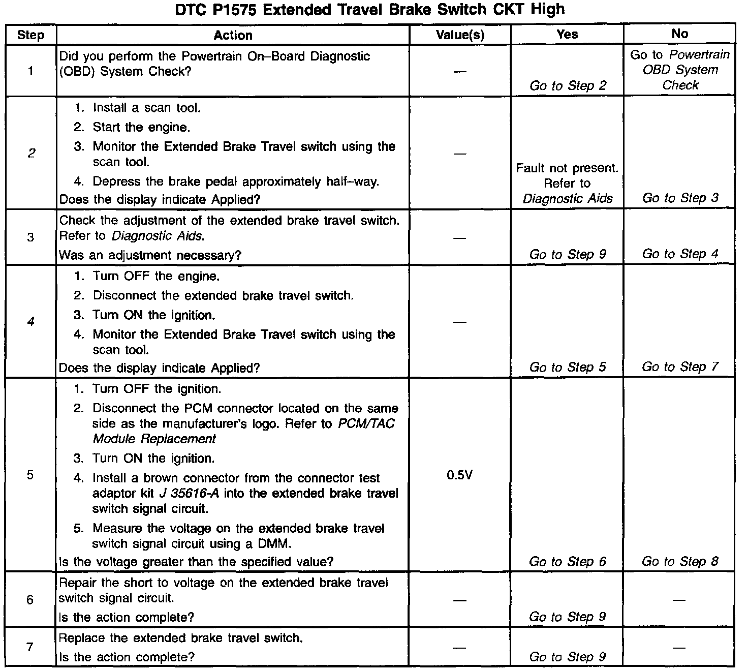 If the PCM senses a voltage on the Extended Travel Brake Switch signal circuit when the Extended Travel Brake Switch should be open, this DTC sets.