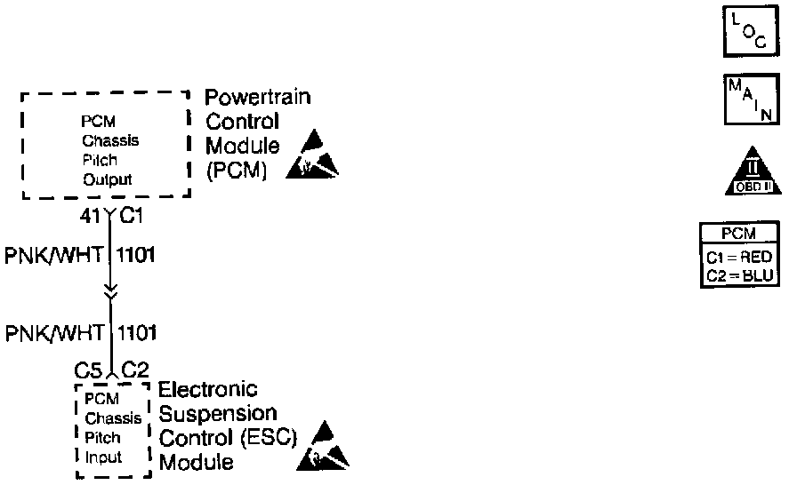 The PCM receives an ignition voltage feed from the Electronic Suspension Control module on the Powertrain Induced Chassis Pitch circuit. The PCM grounds this circuit when the vehicle accelerates rapidly or brakes hard. When the chassis pitch input circuit goes low (about 0.0 volts), the ESC module commands all four shock absorber solenoids to a firm position. The PCM calculates the chassis pitch information based on the engine torque and the vehicle braking force.