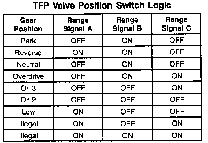 The Powertrain Control Module (PCM) supplies the battery voltage for each range signal. By grounding one or more of the circuits through various combinations of the pressure switches, the PCM detects which manual valve position you select. The PCM compares the actual voltage combination of the switches to a TFP Val. Position Sw. combination chart stored in memory.