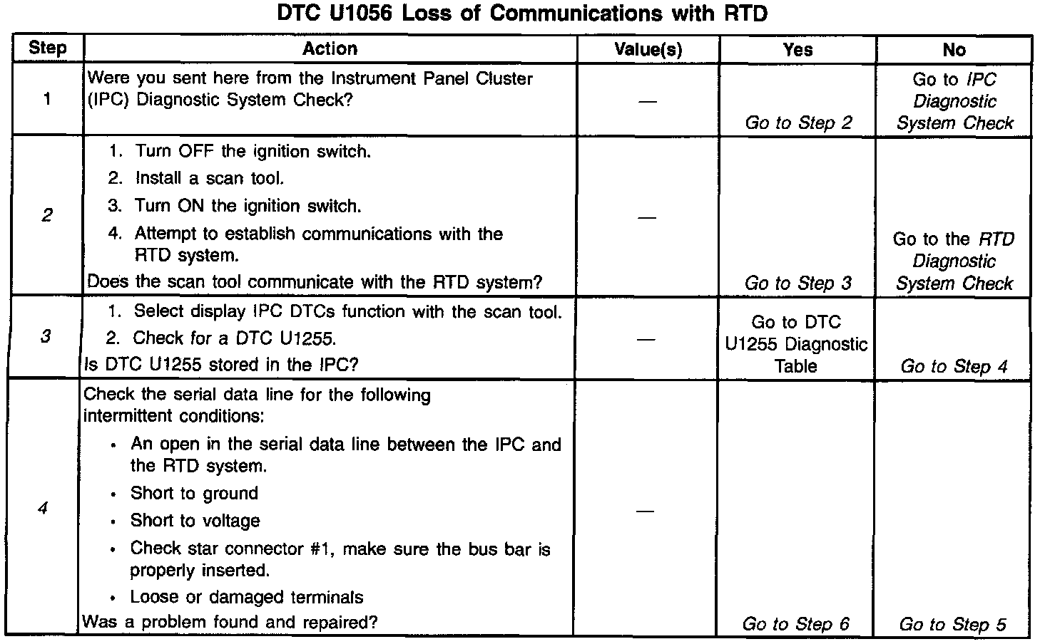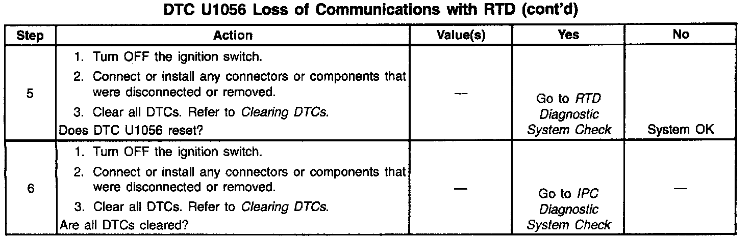 ^ If the serial data line is shorted to ground or shorted to voltage, all systems connected to the same serial data line will not be able to communicate properly. Systems capable of storing loss of communication DTCs (DTCs with the letter U as a prefix) will have these codes stored in their memory. If a DTC U1056 is stored in the IPC, use a scan tool to monitor communications with the RTD system. If the IPC loses communications with the RTD system at any time, the IPC will store a DTC U1056. Test drive the vehicle while using a scan tool to monitor communications with the RTD system can assist in diagnosing an intermittent malfunction. Check for an open in the serial data line between only the IPC and the RTD system. The IPC and RTD system must also be checked for intermittent operation due to a loss of power or ground. After repairing a DTC U1056, clear all DTCs from all systems capable of storing this DTC.