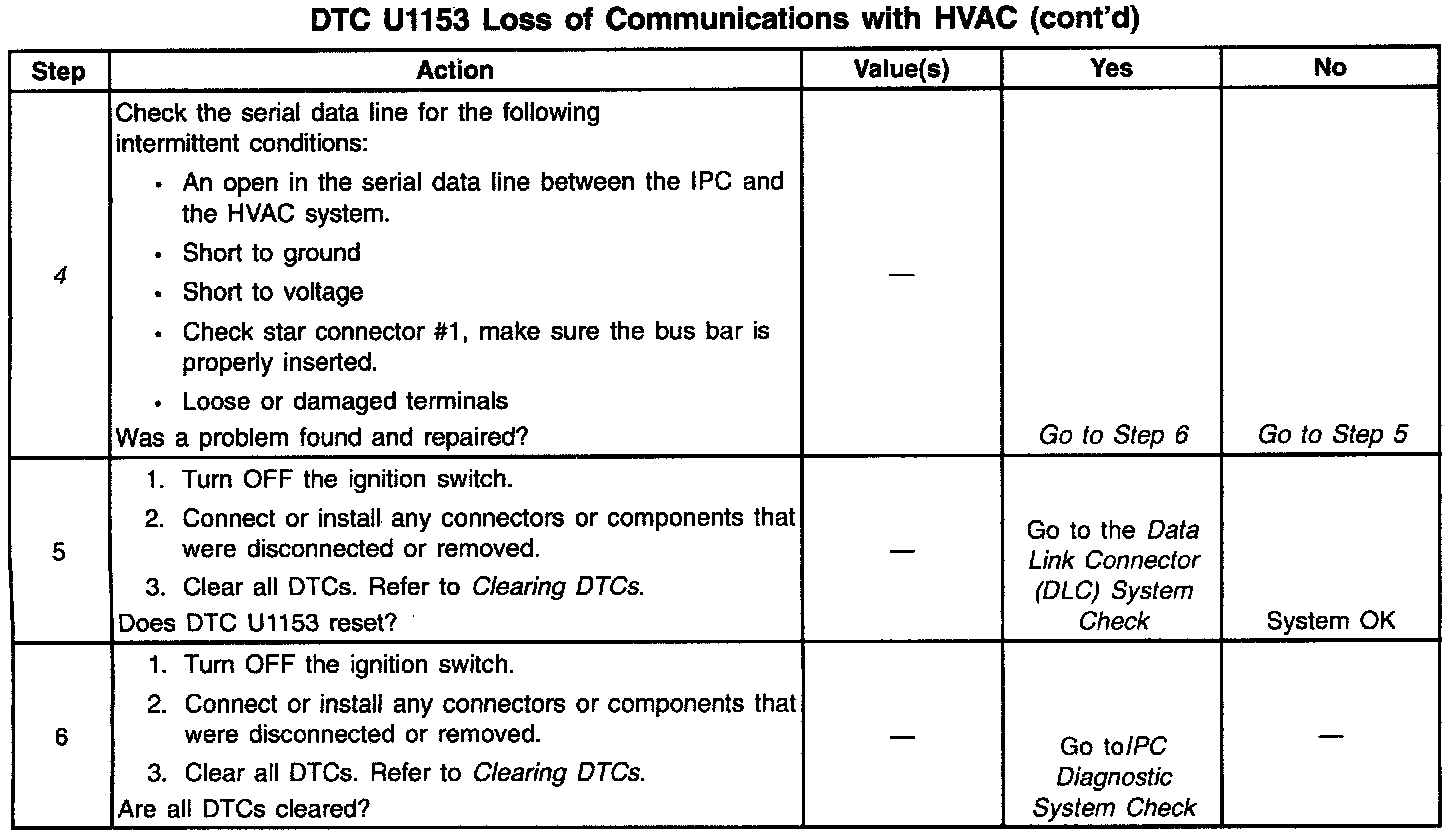 ^ If the serial data line is shorted to ground or shorted to voltage, all systems connected to the same serial data line will not be able to communicate properly. Systems capable of storing loss of communication DTCs (DTCs with the letter U as a prefix) will have these codes stored in their memory. If a DTC U1153 is stored in the IPC, use a scan tool to monitor communications with the HVAC system. If the IPC loses communications with the HVAC system at any time, the IPC will store a DTC U1153. Test drive the vehicle while using a scan tool to monitor communications with the HVAC system can assist in diagnosing an intermittent malfunction. Check for an open in the serial data line between only the IPC and the HVAC system. The IPC and HVAC system must also be checked for intermittent operation due to a loss of power or ground. After repairing a DTC U1153, clear all DTCs from all systems capable of storing this DTC.
