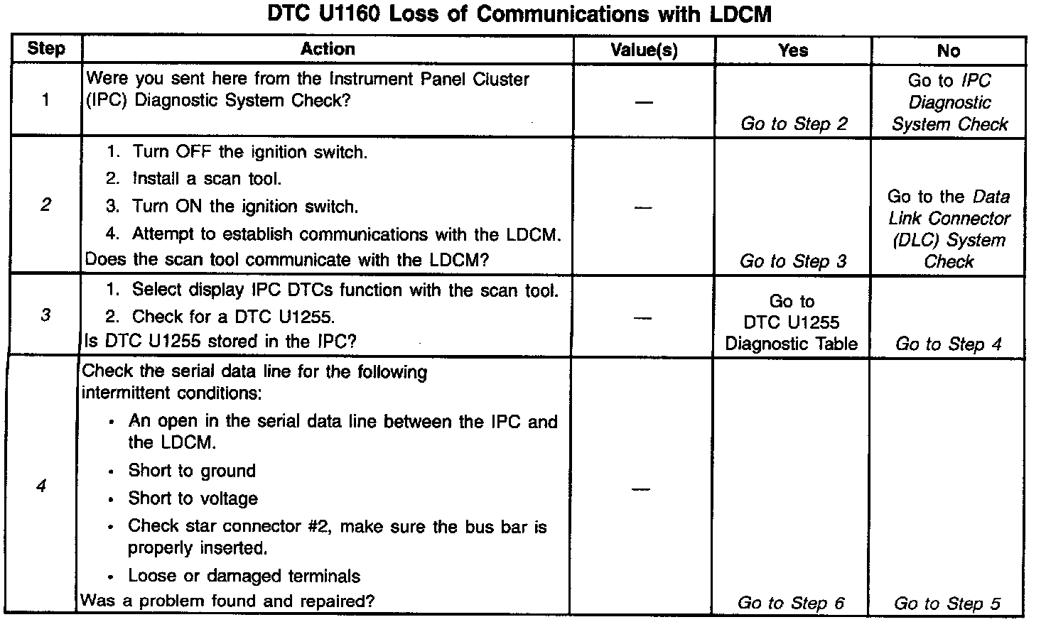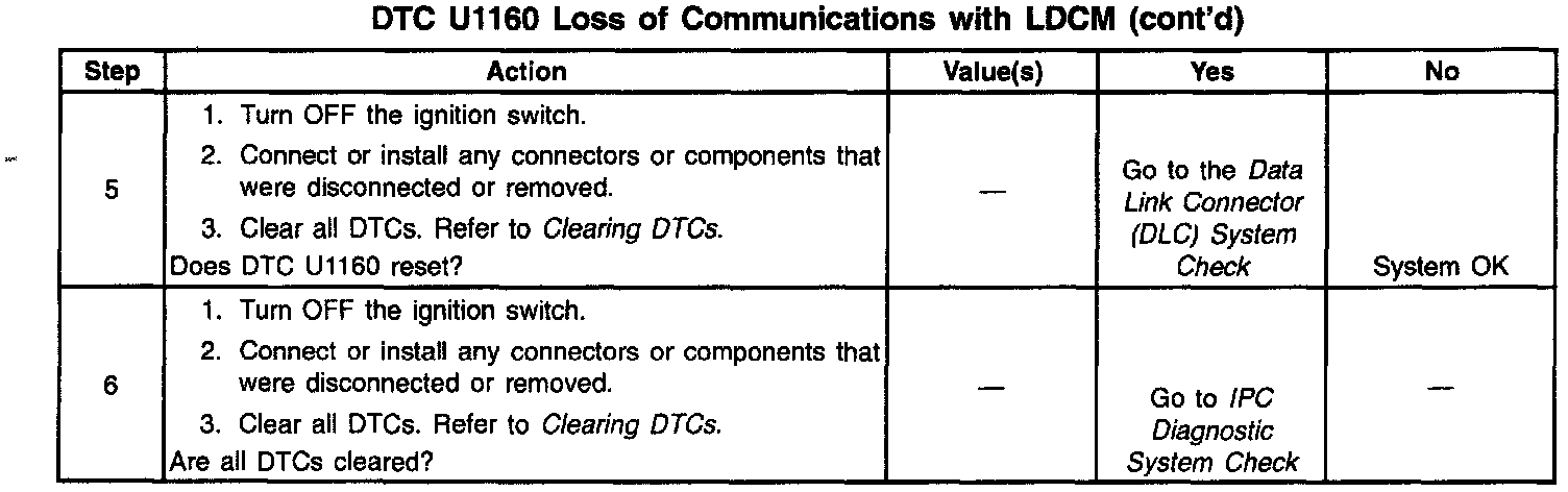 ^ If the serial data line is shorted to ground or shorted to voltage, all systems connected to the same serial data line will not be able to communicate properly. Systems capable of storing loss of communication DTCs (DTCs with the letter U as a prefix) will have these codes stored in their memory. If a DTC U1160 is stored in the IPC, use a scan tool to monitor communications with the LDCM. If the IPC loses communications with the LDCM at any time, the IPC will store a DTC U1160. Test drive the vehicle while using a scan tool to monitor communications with the LDCM can assist in diagnosing an intermittent malfunction. Check for an open in the serial data line between only the IPC and the LDCM. The IPC and LDCM must also be checked for intermittent operation due to a loss of power or ground. After repairing a DTC U1160, clear all DTCs from all systems capable of storing this DTC.