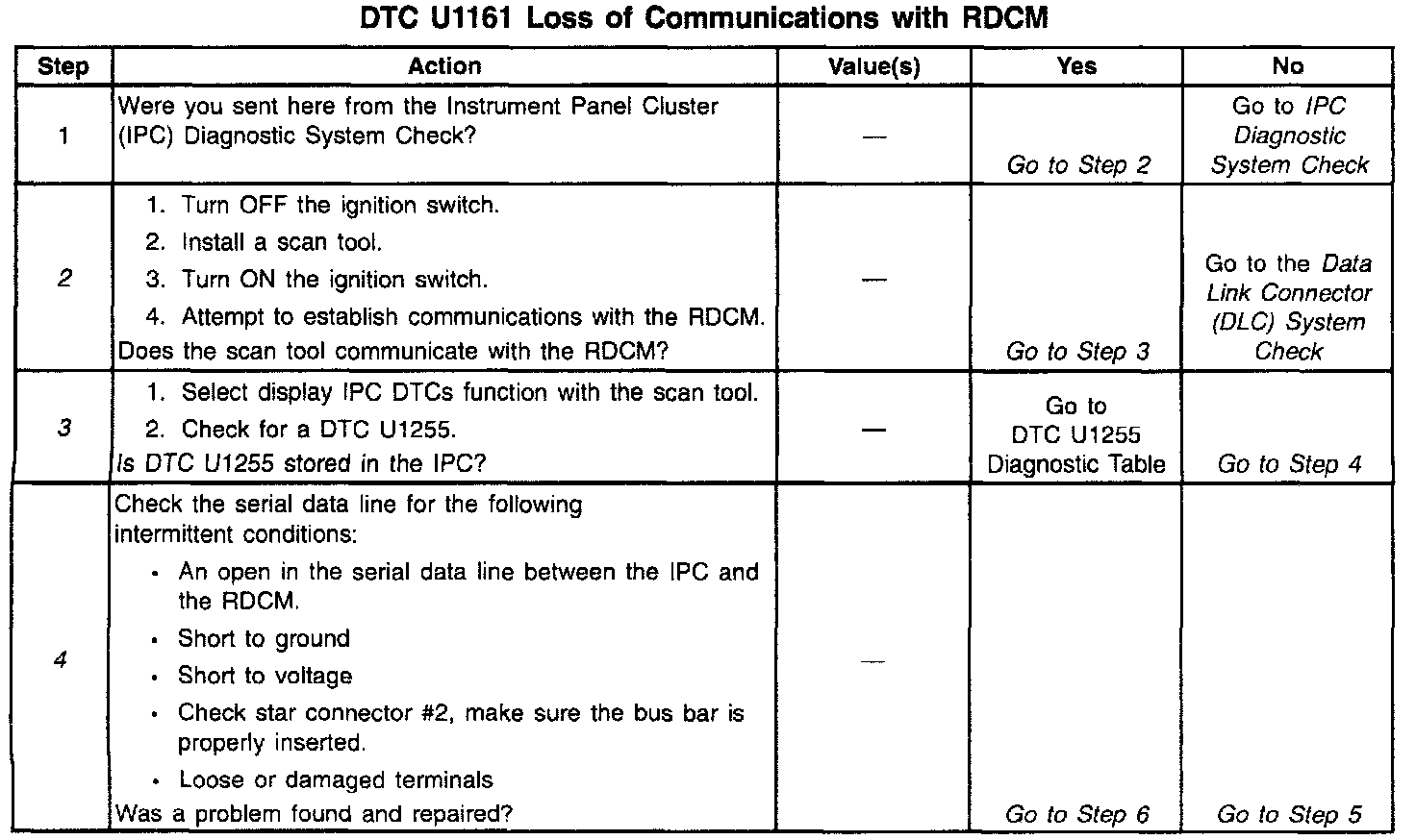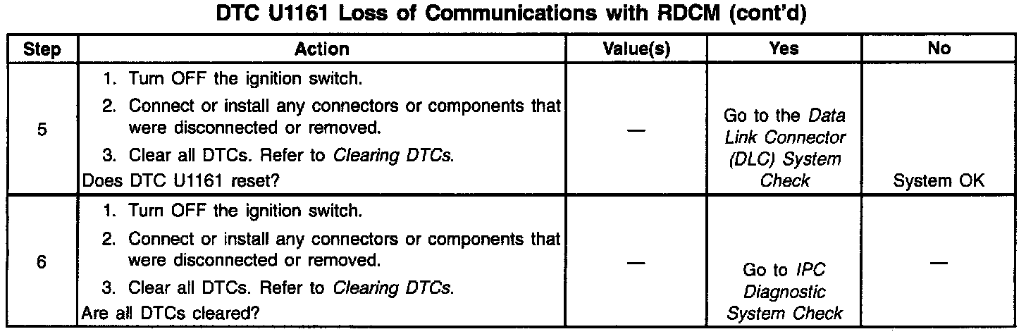 ^ If the serial data line is shorted to ground or shorted to voltage, all systems connected to the same serial data line will not be able to communicate properly. Systems capable of storing loss of communication DTCs (DTCs with the letter U as a prefix) will have these codes stored in their memory. If a DTC U1161 is stored in the IPC, use a scan tool to monitor communications with the RDCM. If the IPC loses communications with the RDCM at any time, the IPC will store a DTC U1161. Test drive the vehicle while using a scan tool to monitor communications with the RDCM can assist in diagnosing an intermittent malfunction. Check for an open in the serial data line between only the IPC and the RDCM. The IPC and RDCM must also be checked for intermittent operation due to a loss of power or ground. After repairing a DTC U1161, clear all DTCs from all systems capable of storing this DTC.