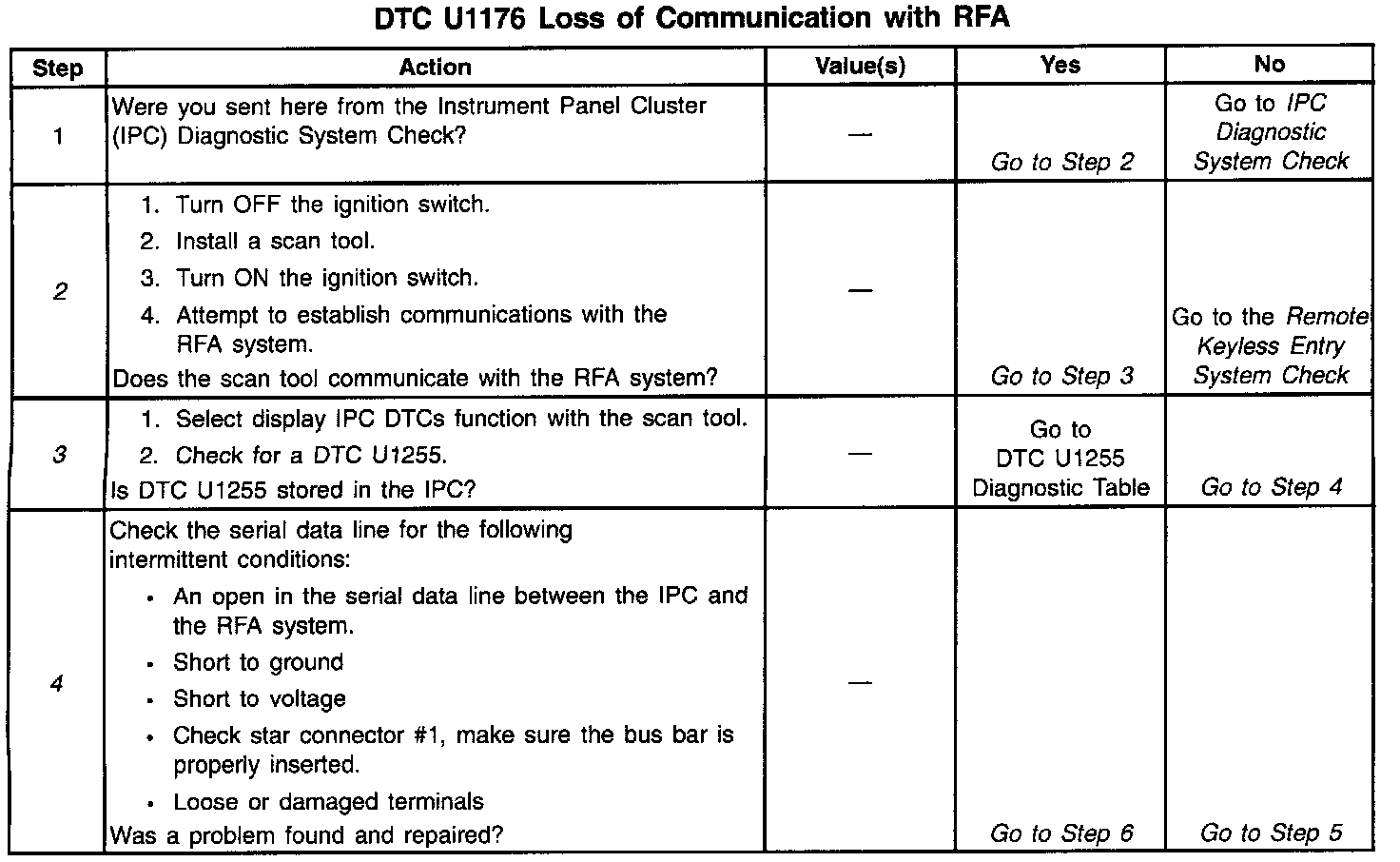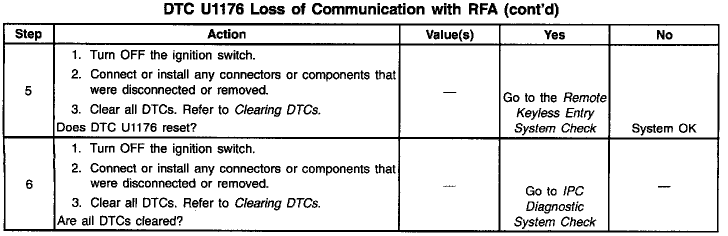 ^ If the serial data line is shorted to ground or shorted to voltage, all systems connected to the same serial data line will not be able to communicate properly. Systems capable of storing loss of communication DTCs (DTCs with the letter U as a prefix) will have these codes stored in their memory. If a DTC U1176 is stored in the IPC, use a scan tool to monitor communications with the RFA system. If the IPC loses communications with the RFA system at any time, the IPC will store a DTC U1176. Test drive the vehicle while using a scan tool to monitor communications with the RFA system can assist in diagnosing an intermittent malfunction. Check for an open in the serial data line between only the IPC and the RFA system. The IPC and RFA system must also be checked for intermittent operation due to a loss of power or ground. After repairing a DTC U1176, clear all DTCs from all systems capable of storing this DTC.