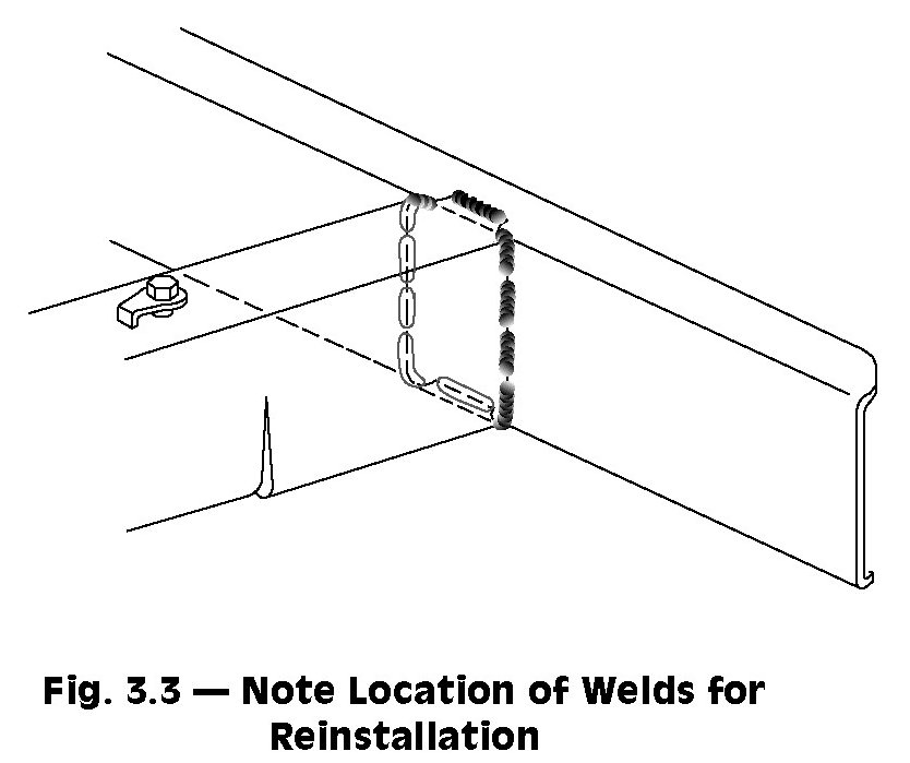 4. Cut the welds around the perimeter of the frame rail (fishmouth) ends (Fig.3.3). Cut welds favoring the impact bar side of the joint. DO NOT cut into the frame rails.