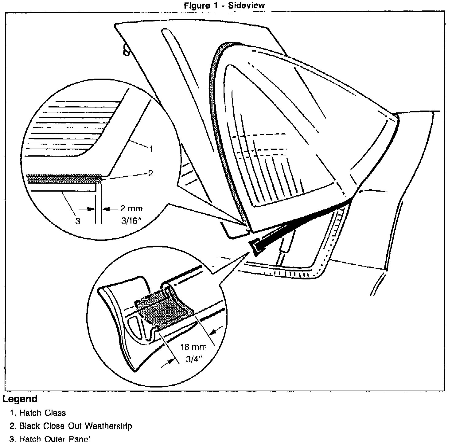 2. With weatherstrip pulled down, measure 18 mm (3/4 in.) from end of weatherstrip and remove shaded area from weatherstrip (see Figure 1, bottom view). Reinstall weatherstrip on hatch.