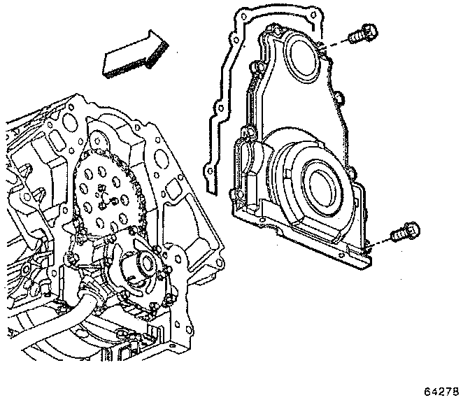 NOTE: Do not reuse the crankshaft oil seals. Install NEW crankshaft oil seals during assembly. Do not reuse the front cover-to-engine block gaskets. Install NEW gaskets during assembly.1. Remove the crankshaft oil seal from the front cover.