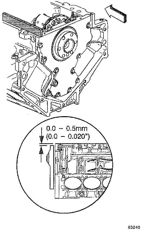 b. Insert a feeler gauge between the rear cover and the straight edge. The cover must be flush with the oil pan or no more than 0.5 mm (0.020 inch) below flush.